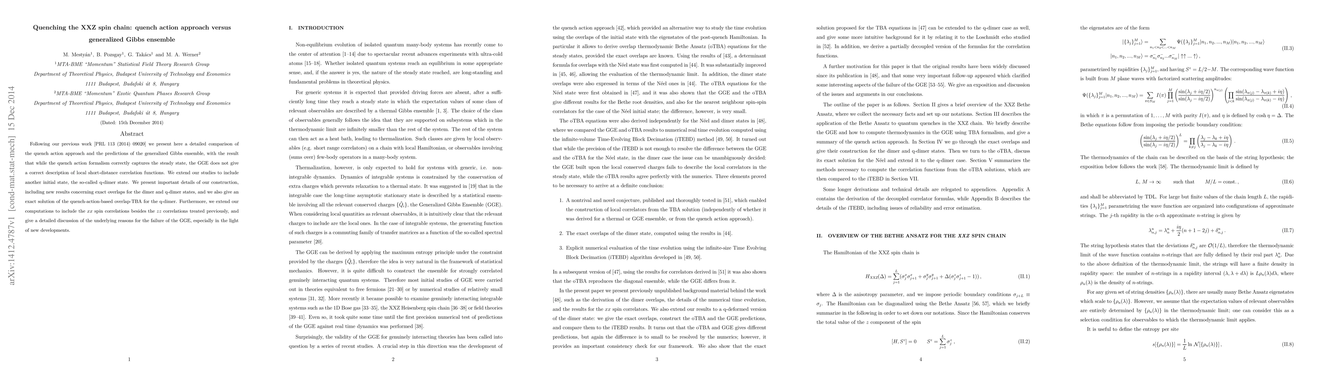Following our previous work [PRL 113 (2014) 09020] we present here a detailed comparison of the quench action approach and the predictions of the generalized Gibbs ensemble, with the result that while the quench action formalism correctly captures the steady state, the GGE does not give a correct description of local short-distance correlation functions. We extend our studies to include another initial state, the so-called q-dimer state. We present important details of our construction, including new results concerning exact overlaps for the dimer and q-dimer states, and we also give an exact solution of the quench-action-based overlap-TBA for the q-dimer. Furthermore, we extend our computations to include the xx spin correlations besides the zz correlations treated previously, and give a detailed discussion of the underlying reasons for the failure of the GGE, especially in the light of new developments.