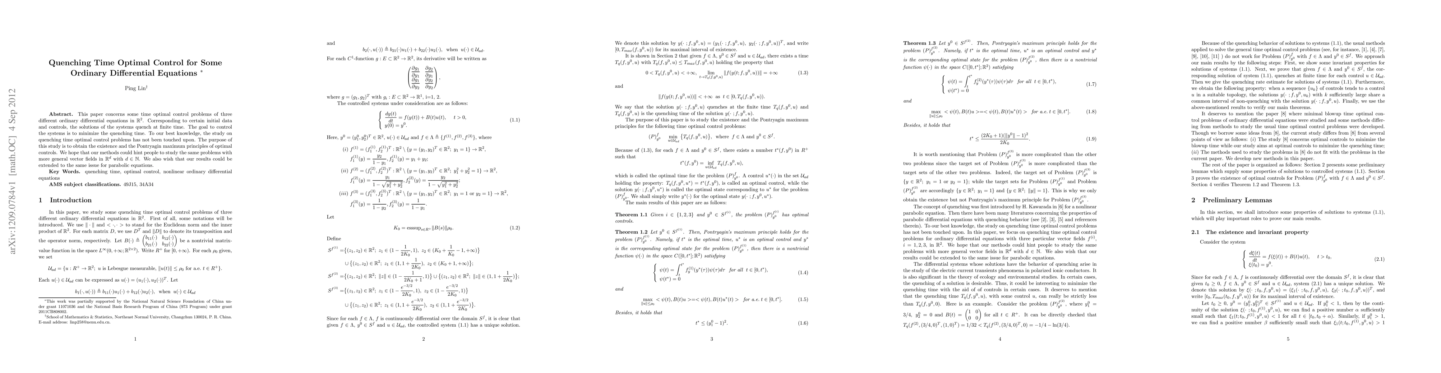 This paper investigates time optimal control problems for three ordinary differential equations in $\mathbb{R}^2$, aiming to minimize the quenching time. It establishes existence and Pontryagin maximum principles for optimal controls, with hopes to inspire further studies on more general vector fields and parabolic equations.