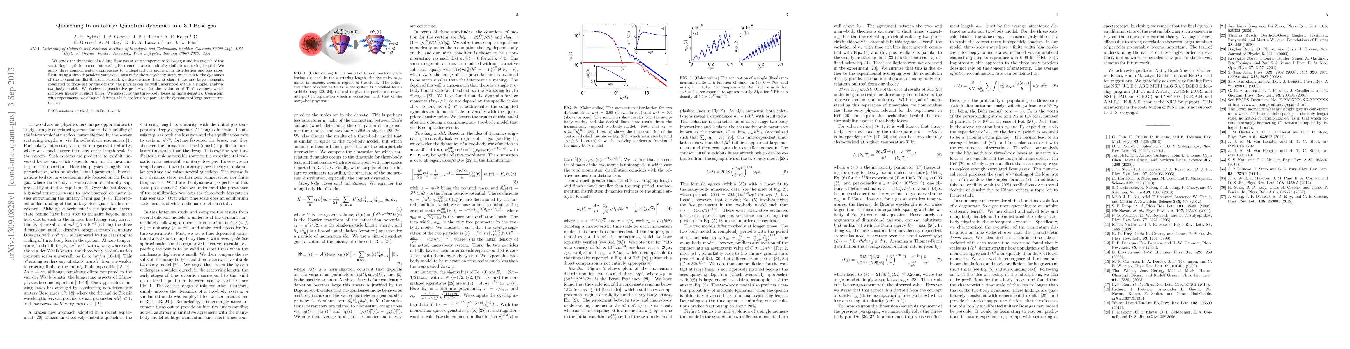 We study the dynamics of a dilute Bose gas at zero temperature following a sudden quench of the scattering length from a noninteracting Bose condensate to unitarity (infinite scattering length). We apply three complementary approaches to understand the momentum distribution and loss rates. First, using a time-dependent variational ansatz for the many-body state, we calculate the dynamics of the momentum distribution. Second, we demonstrate that, at short times and large momenta compared to those set by the density, the physics can be well understood within a simple, analytic two-body model. We derive a quantitative prediction for the evolution of Tan's contact, which increases linearly at short times. We also study the three-body losses at finite densities. Consistent with experiments, we observe lifetimes which are long compared to the dynamics of large momentum modes.