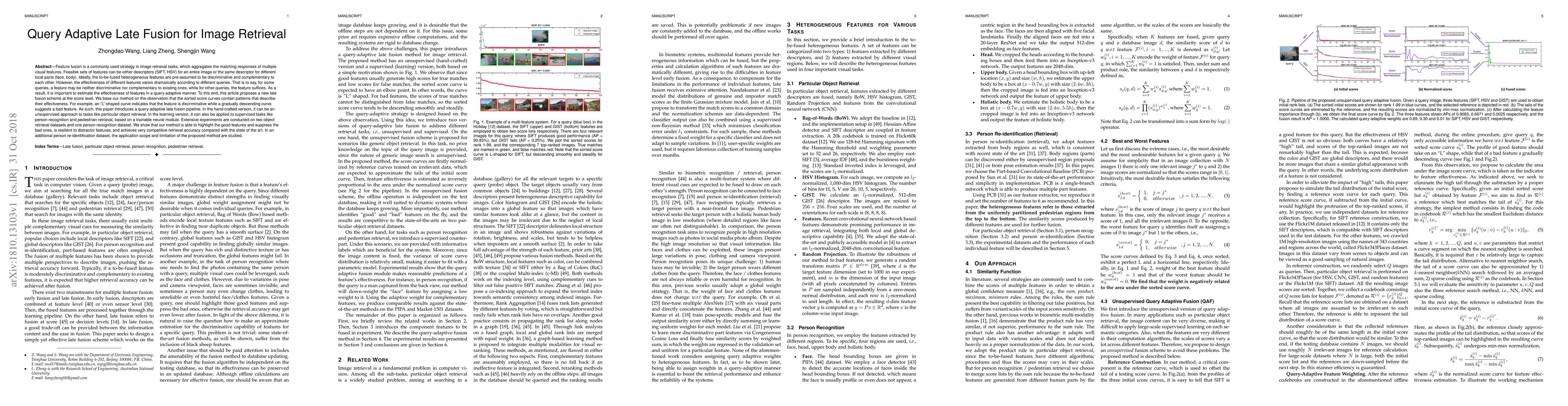 This paper proposes a query-adaptive late fusion scheme for image retrieval that dynamically assesses the effectiveness of various features based on sorted score curves. It achieves competitive accuracy by highlighting effective features and suppressing ineffective ones, tested across multiple datasets.