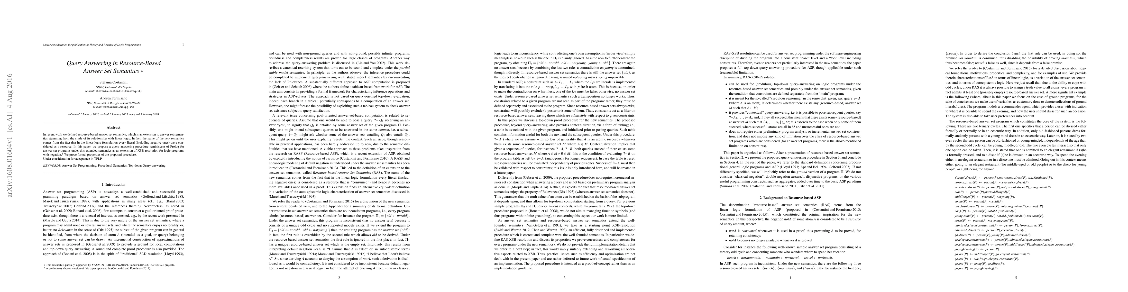 This paper introduces a query-answering procedure for answer set programs under resource-based answer set semantics, extending XSB-resolution, and proves its formal properties. The method is inspired by linear logic, where each literal is treated as a resource.