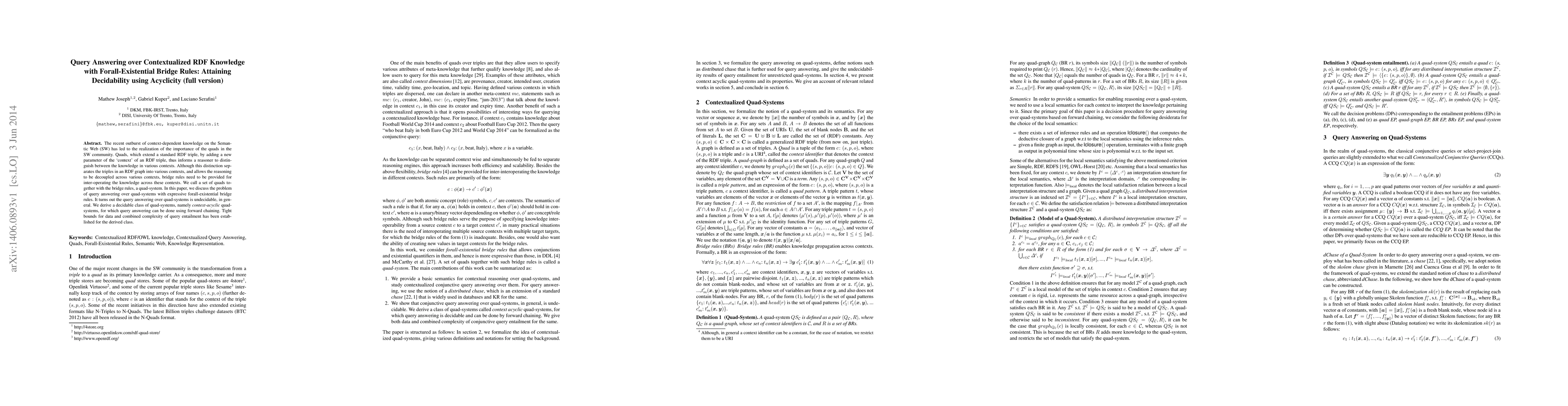 The recent outburst of context-dependent knowledge on the Semantic Web (SW) has led to the realization of the importance of the quads in the SW community. Quads, which extend a standard RDF triple, by adding a new parameter of the `context' of an RDF triple, thus informs a reasoner to distinguish between the knowledge in various contexts. Although this distinction separates the triples in an RDF graph into various contexts, and allows the reasoning to be decoupled across various contexts, bridge rules need to be provided for inter-operating the knowledge across these contexts. We call a set of quads together with the bridge rules, a quad-system. In this paper, we discuss the problem of query answering over quad-systems with expressive forall-existential bridge rules. It turns out the query answering over quad-systems is undecidable, in general. We derive a decidable class of quad-systems, namely context-acyclic quad-systems, for which query answering can be done using forward chaining. Tight bounds for data and combined complexity of query entailment has been established for the derived class.