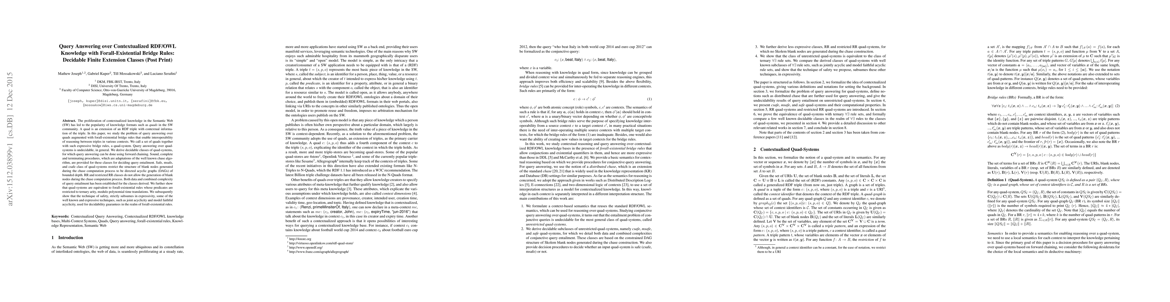 The proliferation of contextualized knowledge in the Semantic Web (SW) has led to the popularity of knowledge formats such as \emph{quads} in the SW community. A quad is an extension of an RDF triple with contextual information of the triple. In this paper, we study the problem of query answering over quads augmented with forall-existential bridge rules that enable interoperability of reasoning between triples in various contexts. We call a set of quads together with such expressive bridge rules, a quad-system. Query answering over quad-systems is undecidable, in general. We derive decidable classes of quad-systems, for which query answering can be done using forward chaining. Sound, complete and terminating procedures, which are adaptations of the well known chase algorithm, are provided for these classes for deciding query entailment. Safe, msafe, and csafe class of quad-systems restrict the structure of blank nodes generated during the chase computation process to be directed acyclic graphs (DAGs) of bounded depth. RR and restricted RR classes do not allow the generation of blank nodes during the chase computation process. Both data and combined complexity of query entailment has been established for the classes derived. We further show that quad-systems are equivalent to forall-existential rules whose predicates are restricted to ternary arity, modulo polynomial time translations. We subsequently show that the technique of safety, strictly subsumes in expressivity, some of the well known and expressive techniques, such as joint acyclicity and model faithful acyclicity, used for decidability guarantees in the realm of forall-existential rules.