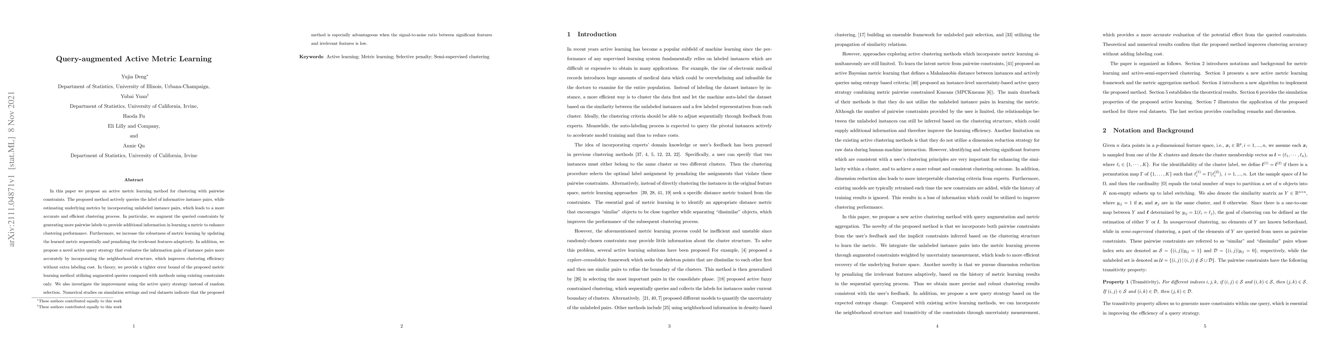 This paper proposes a novel active metric learning method for clustering with pairwise constraints that actively queries informative instance pairs and incorporates unlabeled pairs to improve accuracy and efficiency. The method achieves better performance and is especially advantageous when the signal-to-noise ratio between significant features and irrelevant features is low.