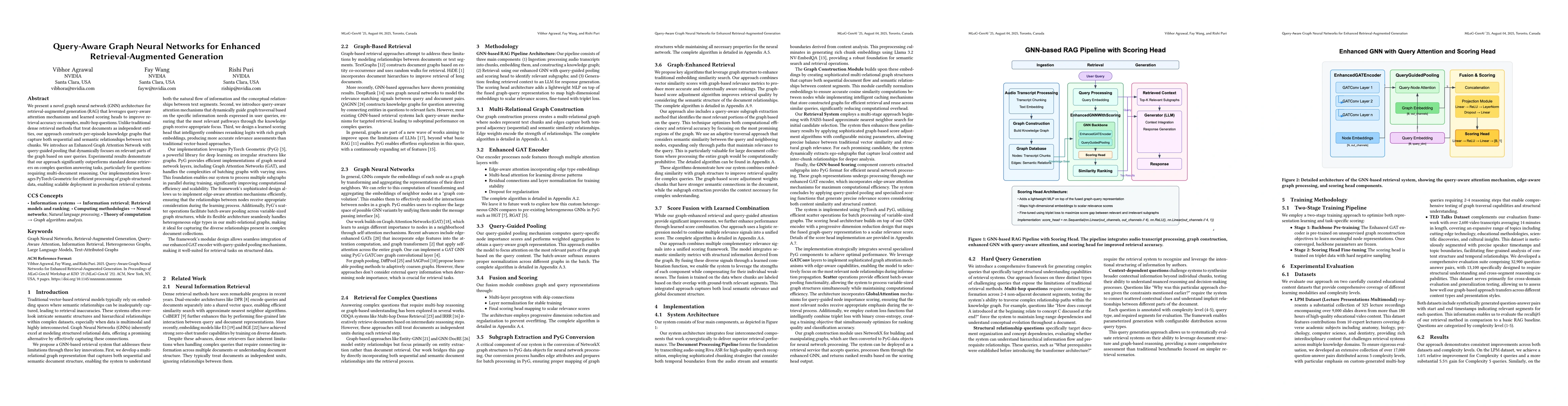 We present a novel graph neural network (GNN) architecture for retrieval-augmented generation (RAG) that leverages query-aware attention mechanisms and learned scoring heads to improve retrieval accuracy on complex, multi-hop questions. Unlike traditional dense retrieval methods that treat documents as independent entities, our approach constructs per-episode knowledge graphs that capture both sequential and semantic relationships between text chunks. We introduce an Enhanced Graph Attention Network with query-guided pooling that dynamically focuses on relevant parts of the graph based on user queries. Experimental results demonstrate that our approach significantly outperforms standard dense retrievers on complex question answering tasks, particularly for questions requiring multi-document reasoning. Our implementation leverages PyTorch Geometric for efficient processing of graph-structured data, enabling scalable deployment in production retrieval systems