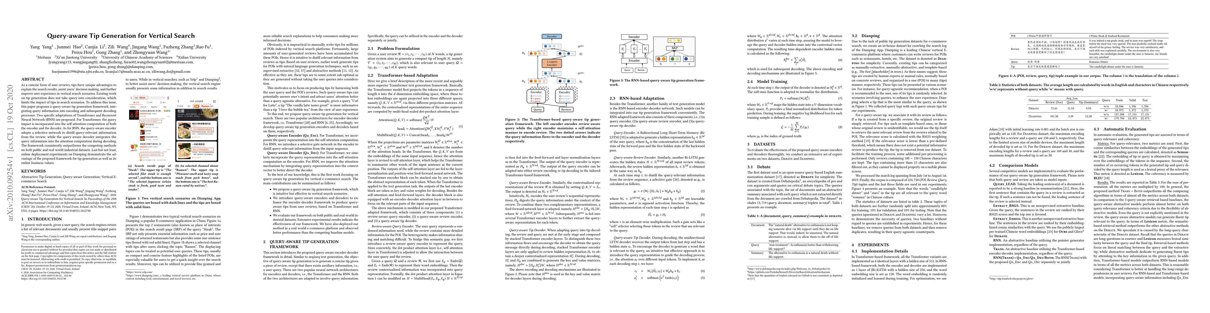 This paper proposes a query-aware tip generation framework that integrates query information into the encoding and decoding processes to improve tip relevance in vertical search. The method outperforms existing approaches on both public and industrial datasets, demonstrating significant benefits in online business contexts.