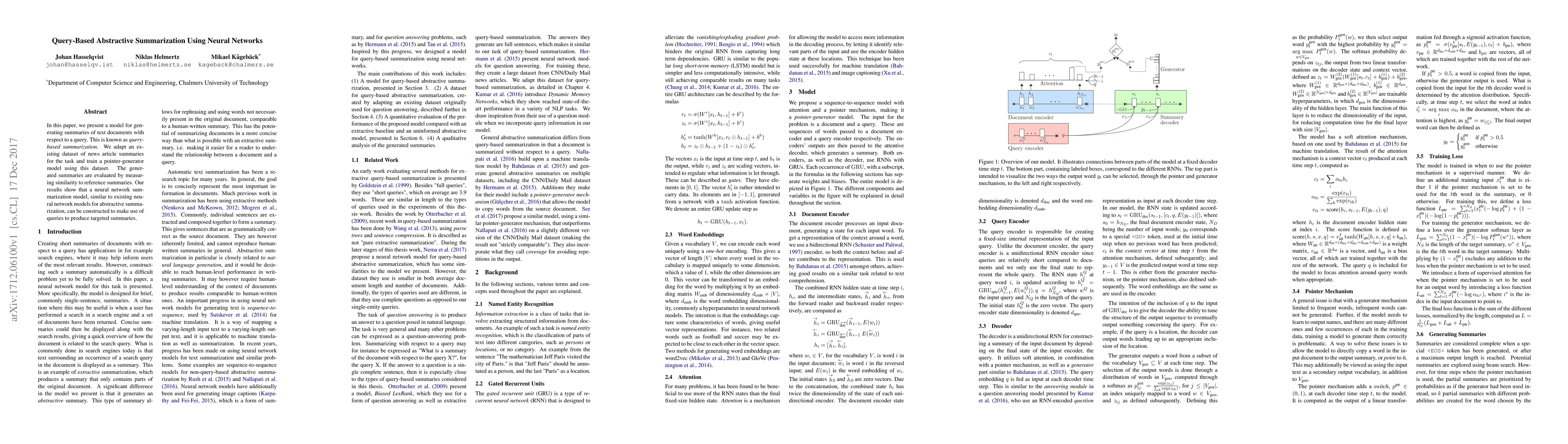 This paper introduces a neural network model for query-based abstractive summarization, trained on a dataset of news article summaries, and demonstrates its ability to generate targeted summaries based on provided queries. Evaluations show the model's effectiveness in producing summaries similar to reference summaries.
