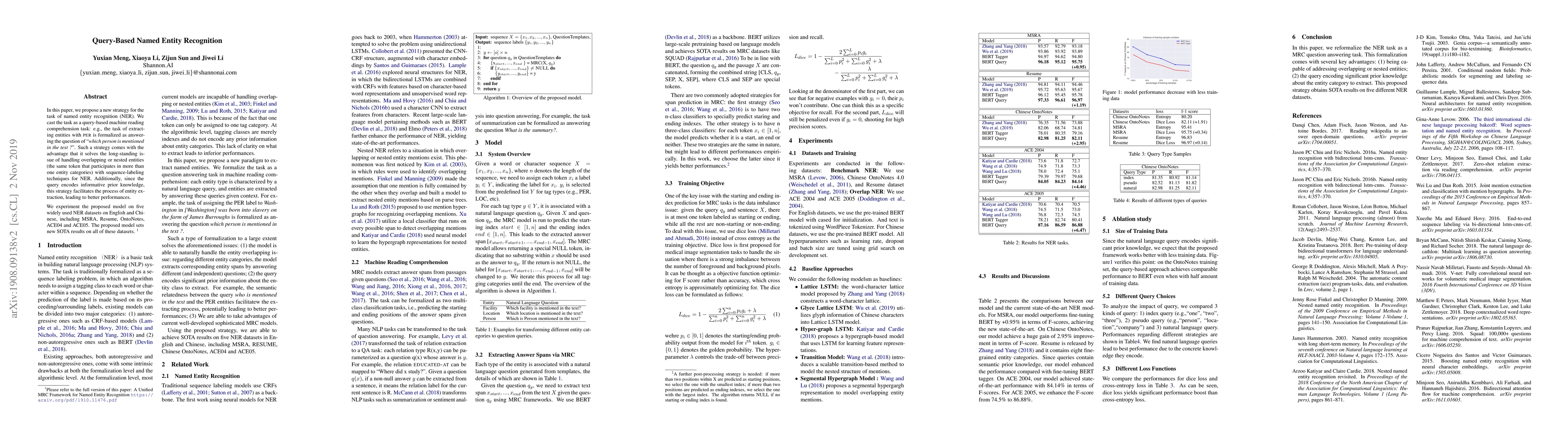 This paper introduces a novel query-based approach for named entity recognition (NER) that frames NER as a machine reading comprehension task, addressing the challenge of overlapping or nested entities. The proposed model achieves state-of-the-art results on five major NER datasets in both English and Chinese.