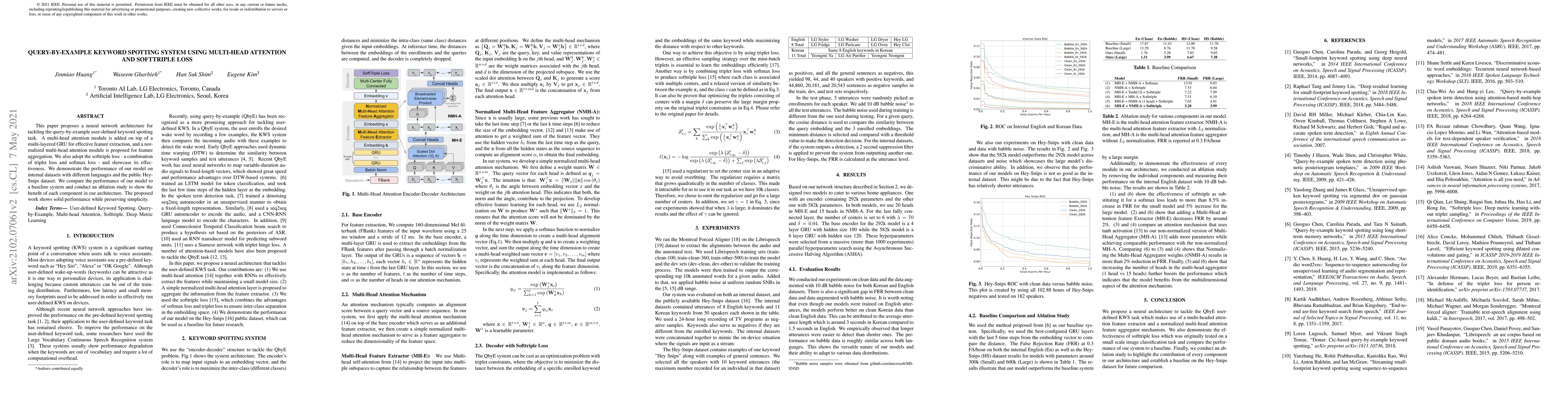 This paper proposes a neural network with multi-head attention and softtriple loss for query-by-example keyword spotting, demonstrating effective feature extraction and aggregation. The model outperforms a baseline and shows benefits from each component, achieving solid performance across multiple datasets.
