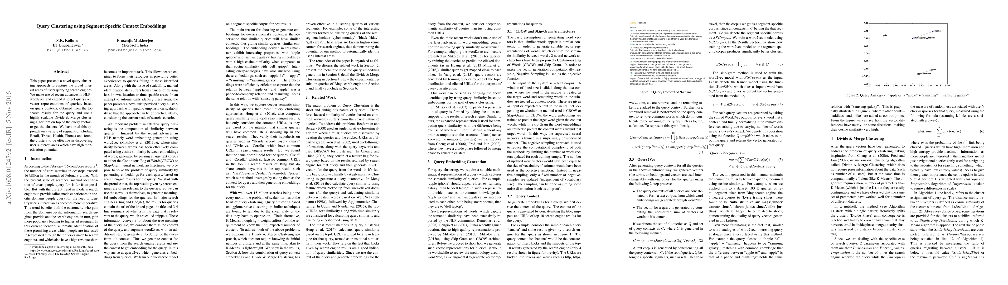 The paper introduces a novel query clustering approach using segment-specific context embeddings, extending word2vec to generate query2vec. It employs a highly scalable Divide & Merge clustering algorithm on top of query vectors, demonstrating effectiveness across various segments like Retail, Travel, Health, and Phones.