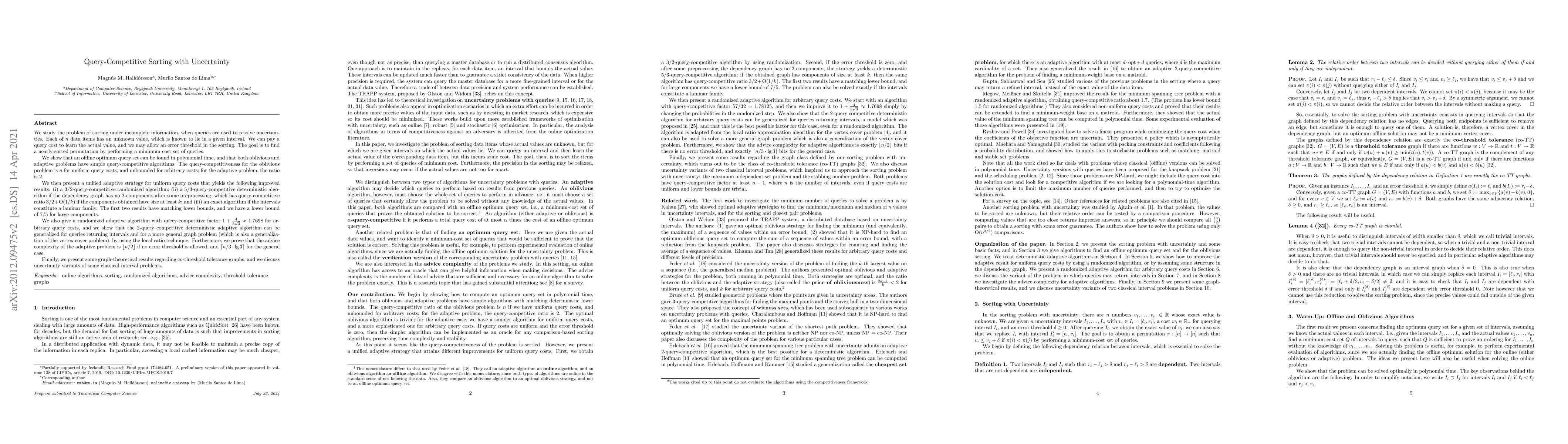 We study the problem of sorting under incomplete information, when queries are used to resolve uncertainties. Each of $n$ data items has an unknown value, which is known to lie in a given interval. We can pay a query cost to learn the actual value, and we may allow an error threshold in the sorting. The goal is to find a nearly-sorted permutation by performing a minimum-cost set of queries. We show that an offline optimum query set can be found in poly time, and that both oblivious and adaptive problems have simple competitive algorithms. The competitive ratio for the oblivious problem is $n$ for uniform query costs, and unbounded for arbitrary costs; for the adaptive problem, the ratio is 2. We present a unified adaptive strategy for uniform costs that yields the following improved results: (1) a 3/2-competitive randomized algorithm; (2) a 5/3-competitive deterministic algorithm if the dependency graph has no 2-components after some preprocessing, which has competitive ratio $3/2+\mathrm{O}(1/k)$ if the components obtained have size at least $k$; and (3) an exact algorithm for laminar families of intervals. The first two results have matching lower bounds, and we have a lower bound of 7/5 for large components. We also give a randomized adaptive algorithm with competitive ratio $1+\frac{4}{3\sqrt{3}}\approx 1.7698$ for arbitrary query costs, and we show that the 2-competitive deterministic adaptive algorithm can be generalized for queries returning intervals and for a more general vertex cover problem, by using the local ratio technique. Moreover, we prove that the advice complexity of the adaptive problem is $\lfloor n/2\rfloor$ if no error threshold is allowed, and $\lceil n/3\cdot\lg 3\rceil$ for the general case. Finally, we present some graph-theoretical results on co-threshold tolerance graphs, and we discuss uncertainty variants of some classical interval problems.