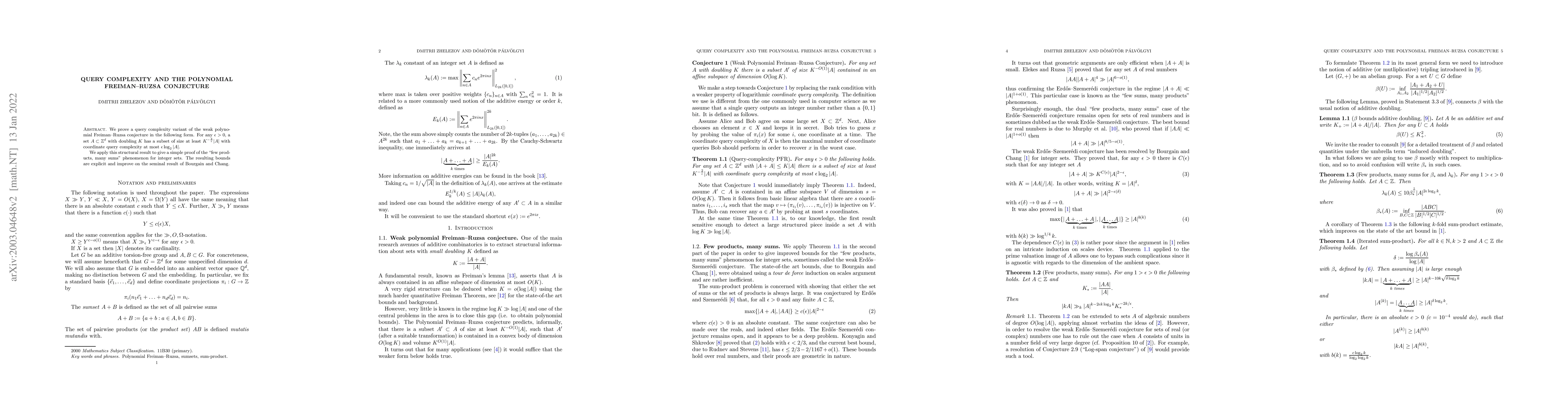 We prove a query complexity variant of the weak polynomial Freiman-Ruzsa conjecture in the following form. For any $\epsilon > 0$, a set $A \subset \mathbb{Z}^d$ with doubling $K$ has a subset of size at least $K^{-\frac{4}{\epsilon}}|A|$ with coordinate query complexity at most $\epsilon \log_2 |A|$. We apply this structural result to give a simple proof of the "few products, many sums" phenomenon for integer sets. The resulting bounds are explicit and improve on the seminal result of Bourgain and Chang.
