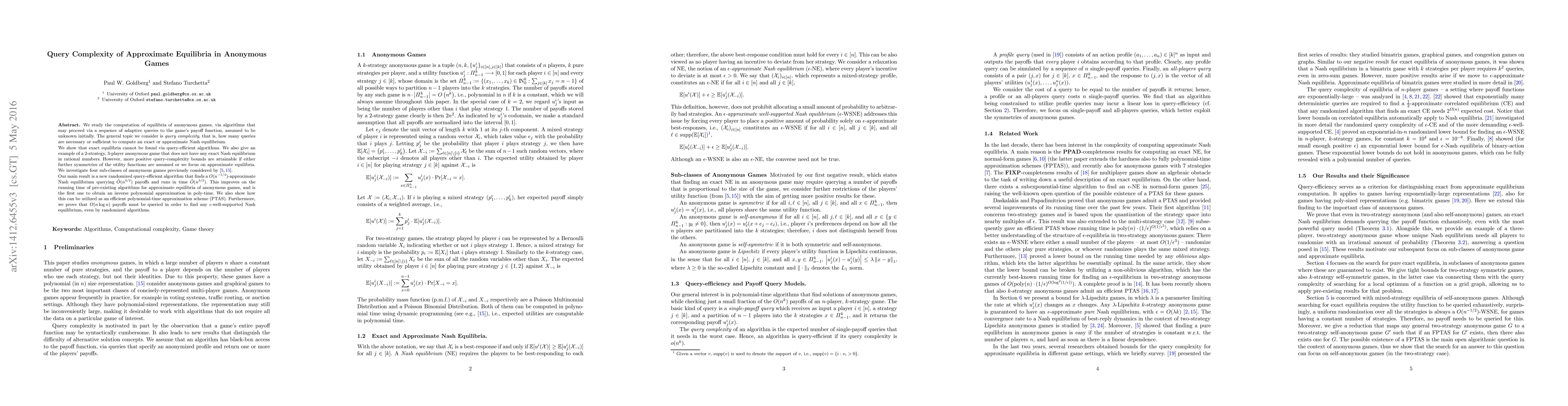 This paper explores the query complexity of computing equilibria in anonymous games, demonstrating that exact equilibria cannot be found efficiently. It introduces a new randomized algorithm that finds an $O(n^{-1/4})$-approximate Nash equilibrium with improved query and running times, marking the first inverse polynomial approximation in polynomial time.