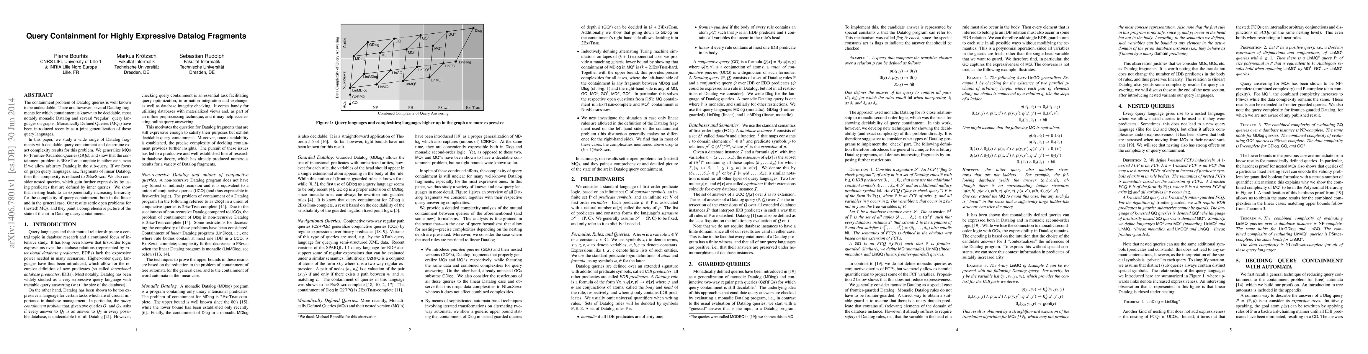 This paper investigates decidable fragments of Datalog for query containment, determining complexity results for containment problems. It generalizes Monadically Defined Queries to Frontier-Guarded Queries, showing 3ExpTime-complete complexity for containment, and 2ExpSpace for graph query languages.