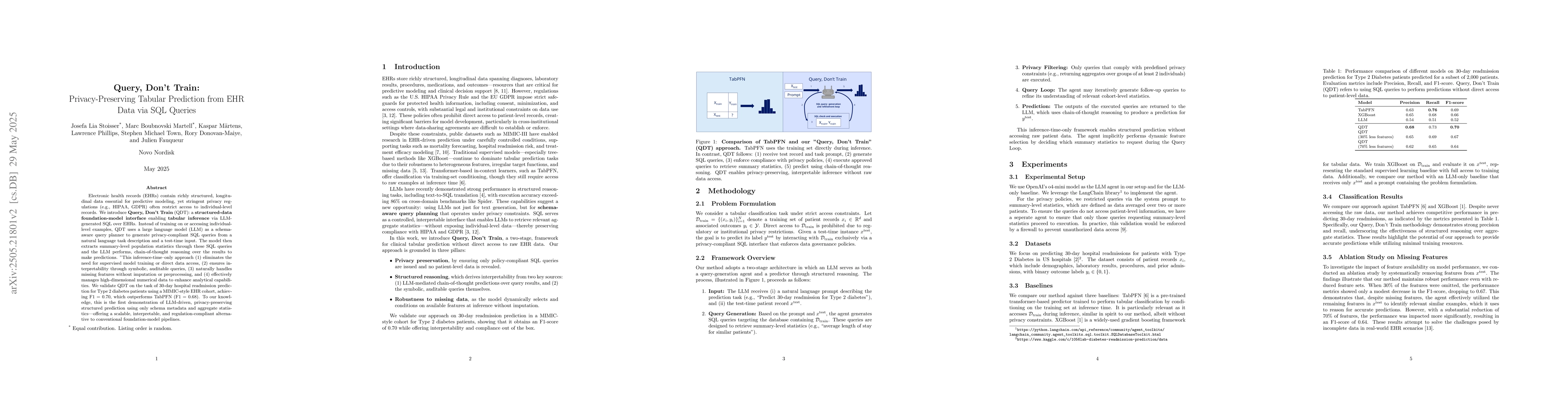 The introduction of Query, Don't Train (QDT), a privacy-preserving tabular prediction method that utilizes LLM-generated SQL queries over EHRs, eliminating the need for training on or accessing individual-level records.