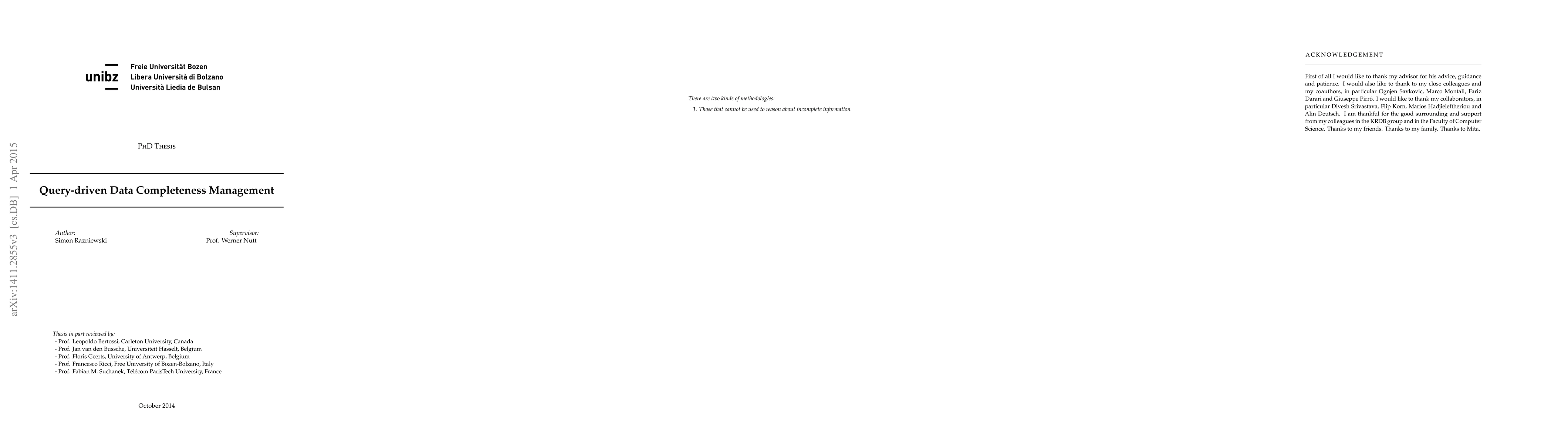 This PhD thesis introduces a framework for assessing data completeness in relational databases, allowing for inference of query answer completeness and verification over processes. The approach can be applied to various data types, including RDF and spatial data.