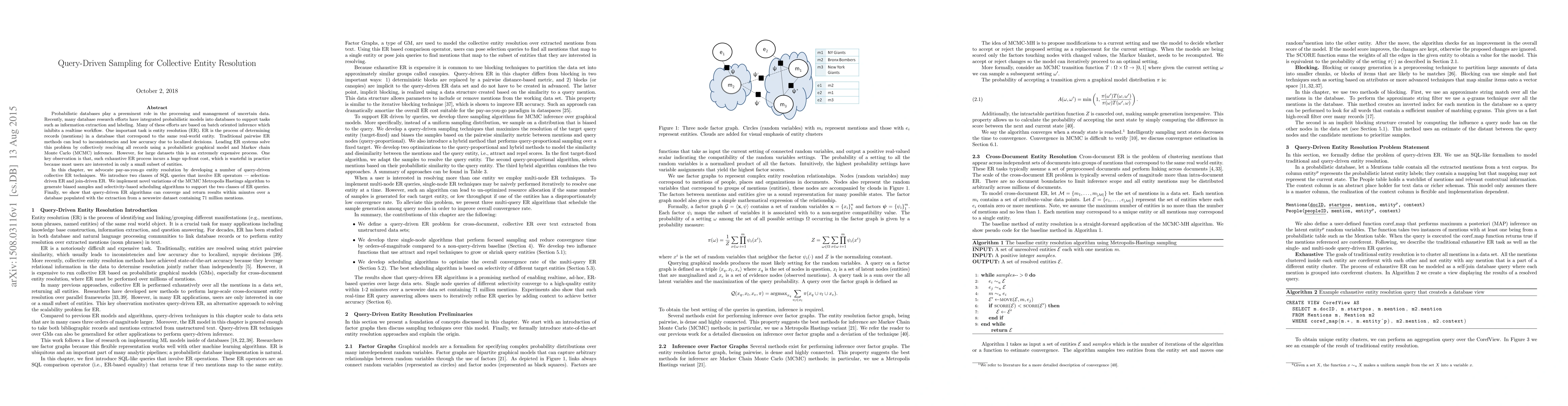 This paper proposes query-driven sampling techniques for collective entity resolution (ER) in probabilistic databases, addressing the inefficiencies of exhaustive batch-oriented ER methods. It introduces SQL query-driven ER techniques, including selection-driven and join-driven ER, supported by novel MCMC algorithms and scheduling to handle large datasets efficiently.
