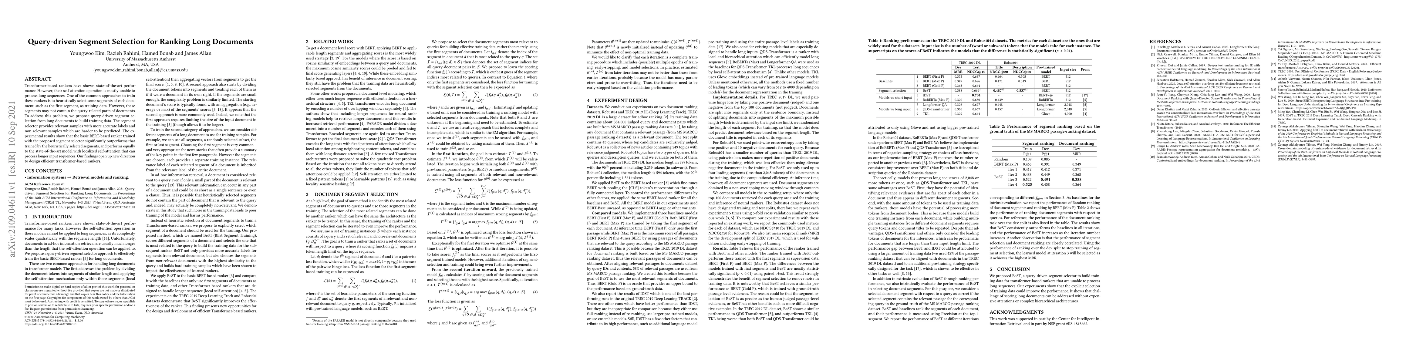 This paper proposes a query-driven segment selection method to enhance transformer-based rankers for long documents, addressing the limitation of self-attention in processing long sequences. The method selects relevant document segments, leading to improved performance compared to heuristic segment selection.