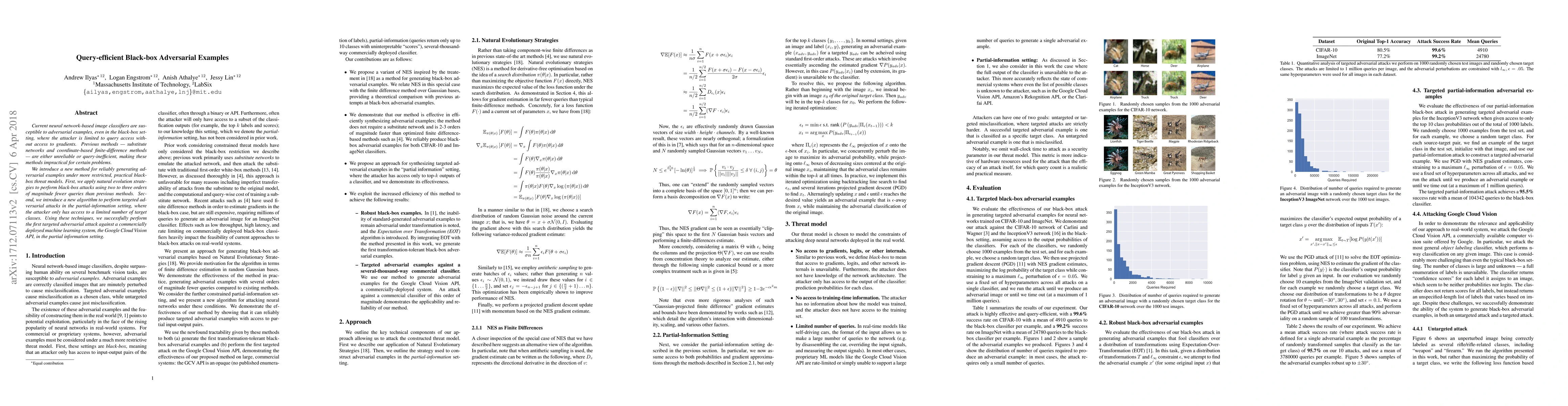 Note that this paper is superceded by "Black-Box Adversarial Attacks with Limited Queries and Information." Current neural network-based image classifiers are susceptible to adversarial examples, even in the black-box setting, where the attacker is limited to query access without access to gradients. Previous methods --- substitute networks and coordinate-based finite-difference methods --- are either unreliable or query-inefficient, making these methods impractical for certain problems. We introduce a new method for reliably generating adversarial examples under more restricted, practical black-box threat models. First, we apply natural evolution strategies to perform black-box attacks using two to three orders of magnitude fewer queries than previous methods. Second, we introduce a new algorithm to perform targeted adversarial attacks in the partial-information setting, where the attacker only has access to a limited number of target classes. Using these techniques, we successfully perform the first targeted adversarial attack against a commercially deployed machine learning system, the Google Cloud Vision API, in the partial information setting.