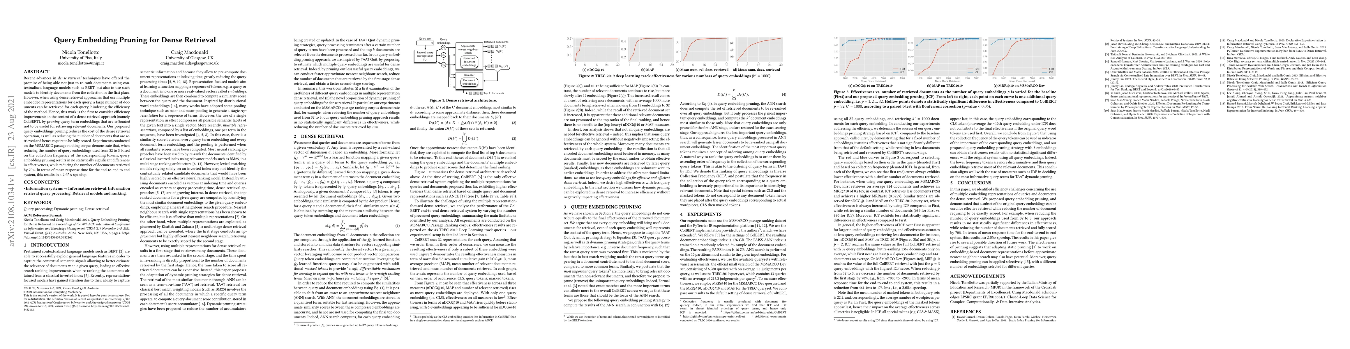 This paper proposes a method to improve the efficiency of dense retrieval systems like ColBERT by pruning query term embeddings that are deemed less useful for document retrieval. The results show no significant loss in effectiveness while reducing the number of documents retrieved by 70%, leading to a 2.65x speedup in mean response time.