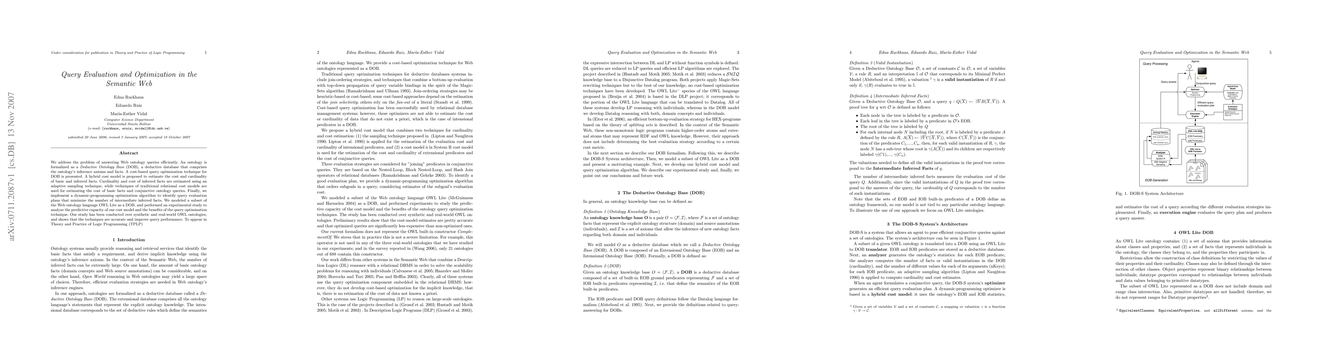 We address the problem of answering Web ontology queries efficiently. An ontology is formalized as a Deductive Ontology Base (DOB), a deductive database that comprises the ontology's inference axioms and facts. A cost-based query optimization technique for DOB is presented. A hybrid cost model is proposed to estimate the cost and cardinality of basic and inferred facts. Cardinality and cost of inferred facts are estimated using an adaptive sampling technique, while techniques of traditional relational cost models are used for estimating the cost of basic facts and conjunctive ontology queries. Finally, we implement a dynamic-programming optimization algorithm to identify query evaluation plans that minimize the number of intermediate inferred facts. We modeled a subset of the Web ontology language OWL Lite as a DOB, and performed an experimental study to analyze the predictive capacity of our cost model and the benefits of the query optimization technique. Our study has been conducted over synthetic and real-world OWL ontologies, and shows that the techniques are accurate and improve query performance. To appear in Theory and Practice of Logic Programming (TPLP).
