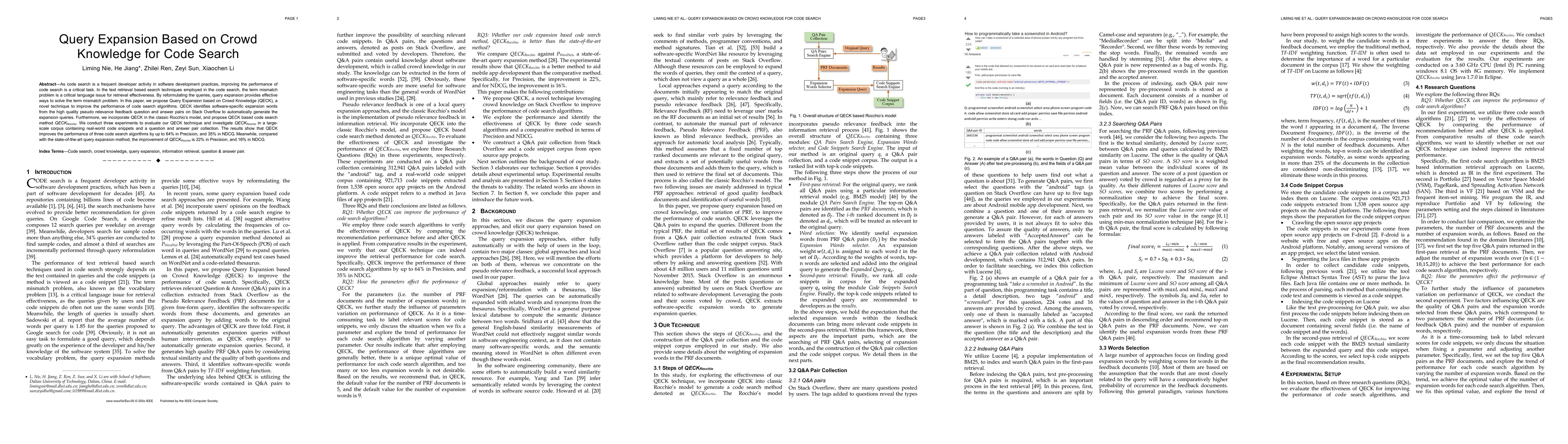 This paper proposes Query Expansion based on Crowd Knowledge (QECK) to enhance code search performance by addressing term mismatch issues. QECK leverages high-quality Stack Overflow Q&A pairs to generate effective query expansions, integrated into Rocchio's model to form QECKRocchio, achieving up to 64% improvement in Precision and 35% in NDCG over baseline methods.