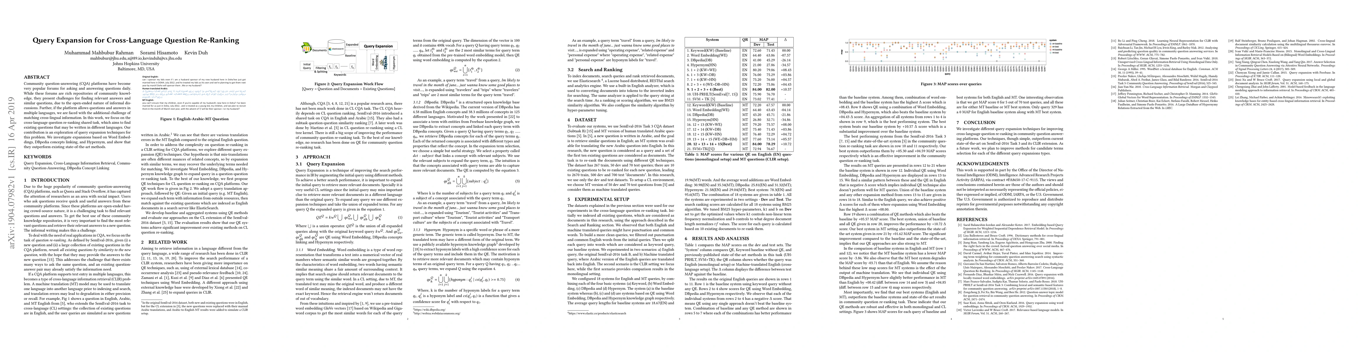 Community question-answering (CQA) platforms have become very popular forums for asking and answering questions daily. While these forums are rich repositories of community knowledge, they present challenges for finding relevant answers and similar questions, due to the open-ended nature of informal discussions. Further, if the platform allows questions and answers in multiple languages, we are faced with the additional challenge of matching cross-lingual information. In this work, we focus on the cross-language question re-ranking shared task, which aims to find existing questions that may be written in different languages. Our contribution is an exploration of query expansion techniques for this problem. We investigate expansions based on Word Embeddings, DBpedia concepts linking, and Hypernym, and show that they outperform existing state-of-the-art methods.