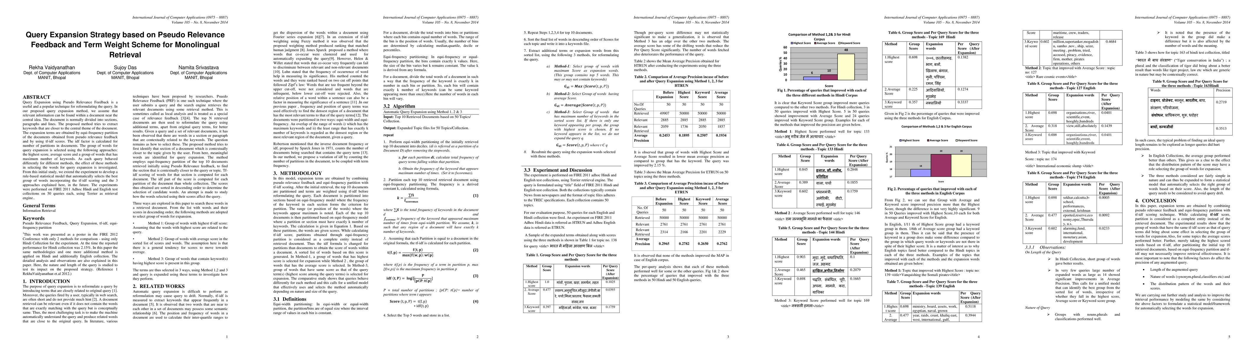 This paper proposes a query expansion strategy using Pseudo Relevance Feedback and term weight schemes to improve monolingual retrieval. The method focuses on extracting keywords near the central theme of documents, utilizing equi-frequency partition and tf-idf scores for term selection, and was tested on FIRE 2011 Adhoc collections with Terrier.