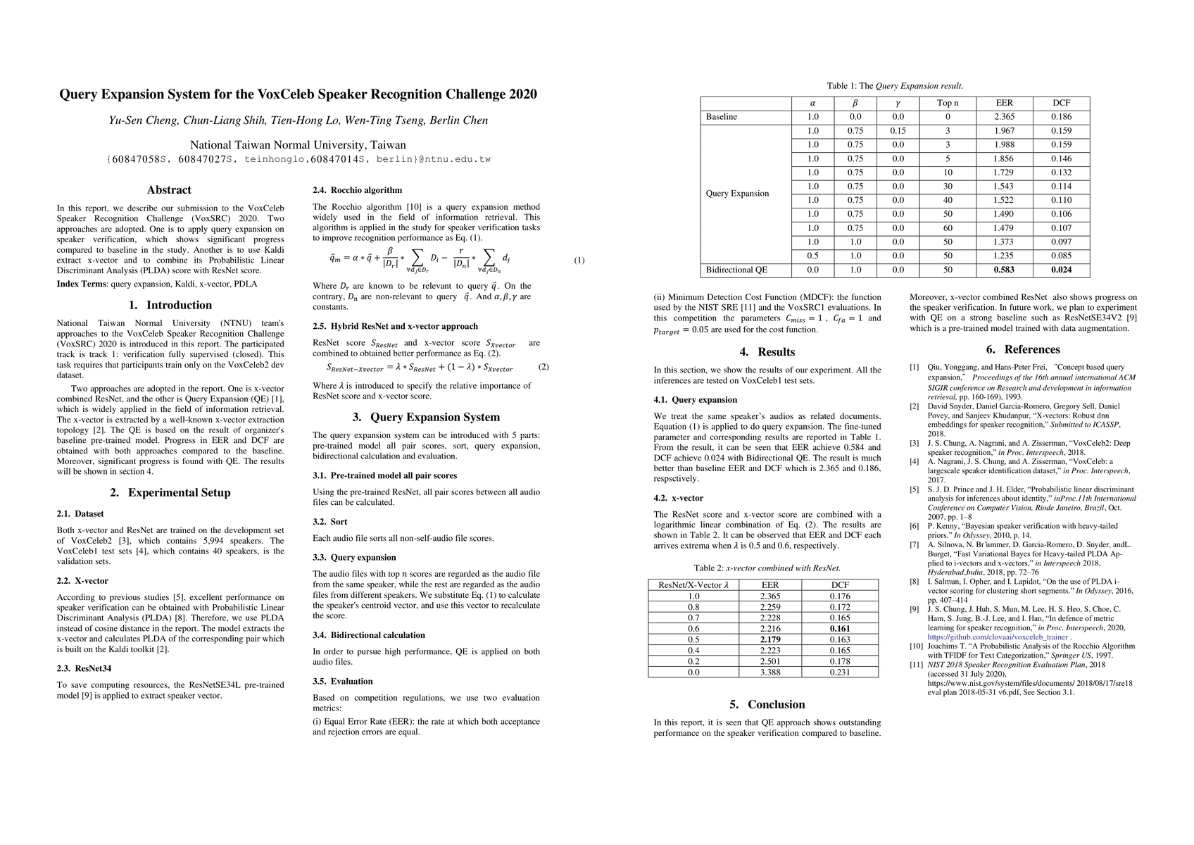 A research paper presents a query expansion system for the VoxCeleb Speaker Recognition Challenge 2020, achieving significant progress over baseline results through speaker verification and combining x-vector and ResNet scores with Probabilistic Linear Discriminant Analysis.