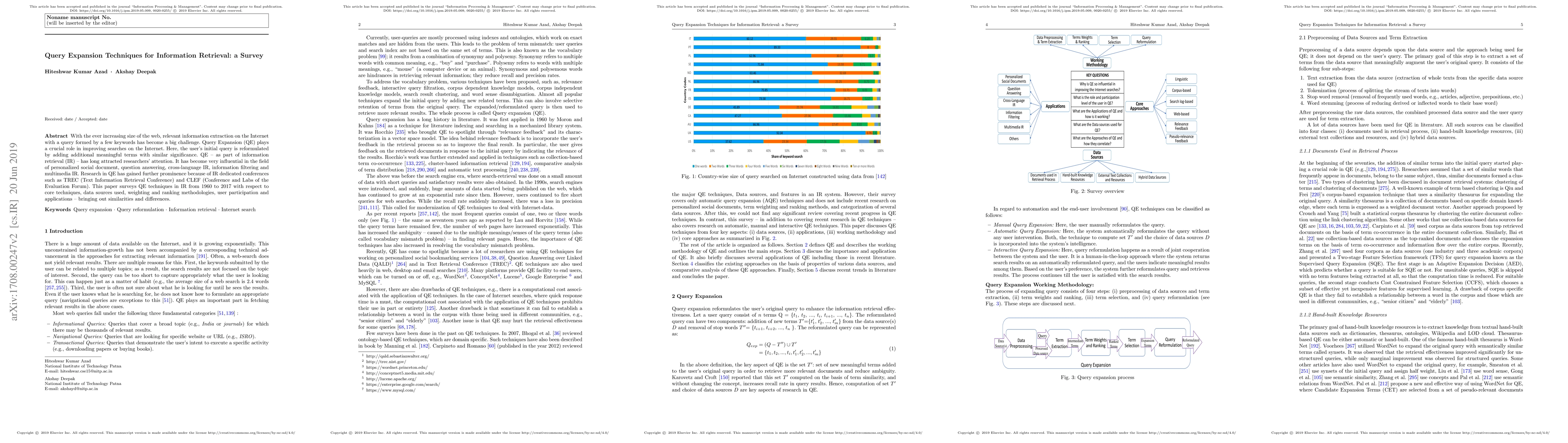 A survey of Query Expansion (QE) techniques in Information Retrieval examines how adding meaningful terms improves search results on the web. The study highlights key findings, methodologies, and implications from 1960 to 2017, shedding light on its influence in various fields.