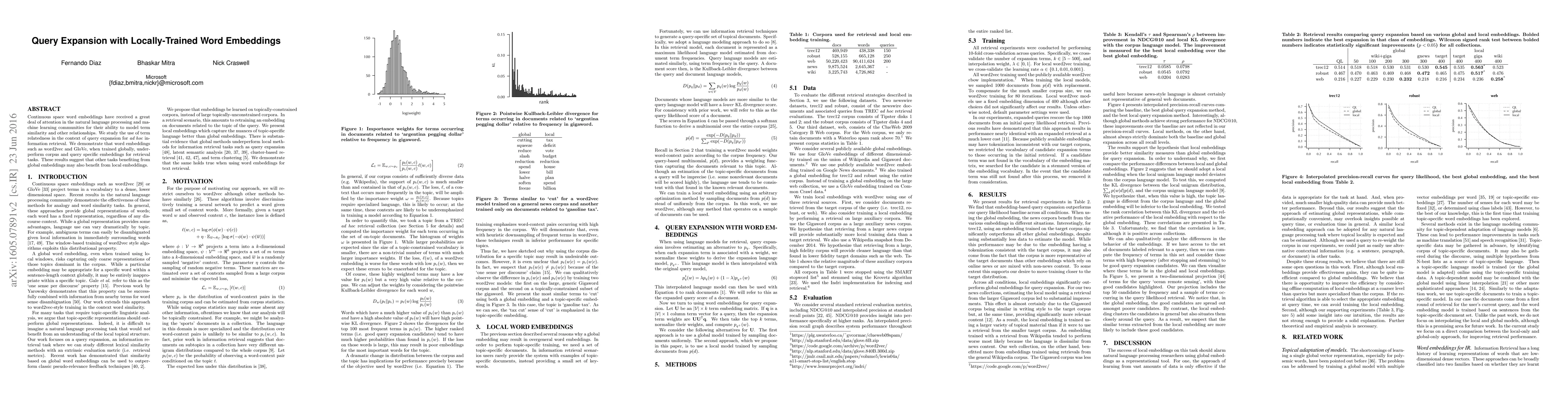 The paper proposes a method for query expansion using locally trained word embeddings, demonstrating their superiority over globally trained embeddings for ad hoc retrieval tasks.