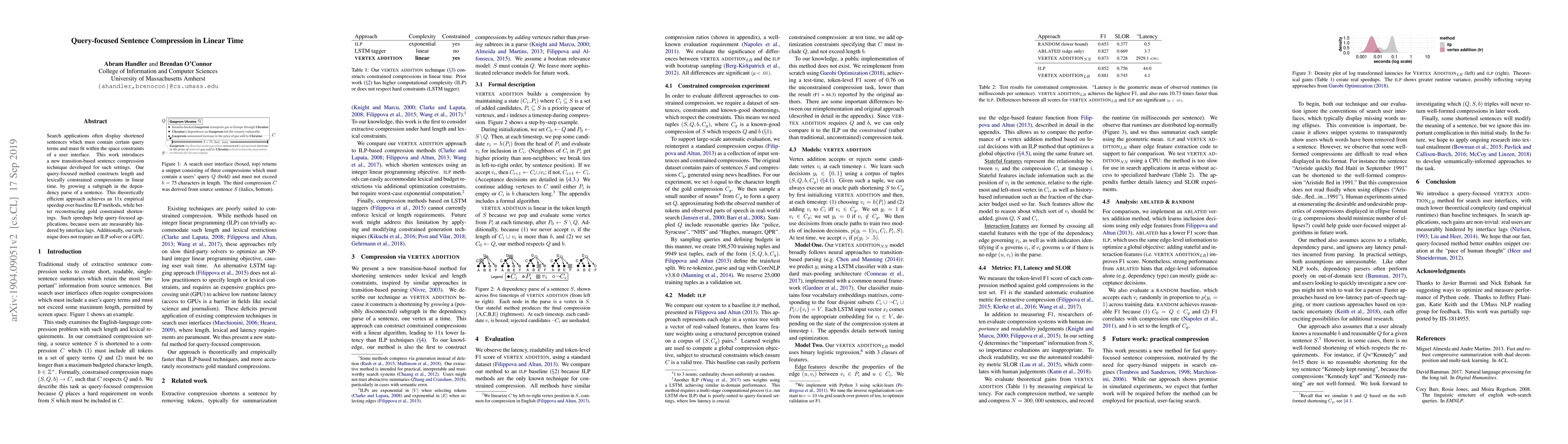 Search applications often display shortened sentences which must contain certain query terms and must fit within the space constraints of a user interface. This work introduces a new transition-based sentence compression technique developed for such settings. Our query-focused method constructs length and lexically constrained compressions in linear time, by growing a subgraph in the dependency parse of a sentence. This theoretically efficient approach achieves an 11X empirical speedup over baseline ILP methods, while better reconstructing gold constrained shortenings. Such speedups help query-focused applications, because users are measurably hindered by interface lags. Additionally, our technique does not require an ILP solver or a GPU.
