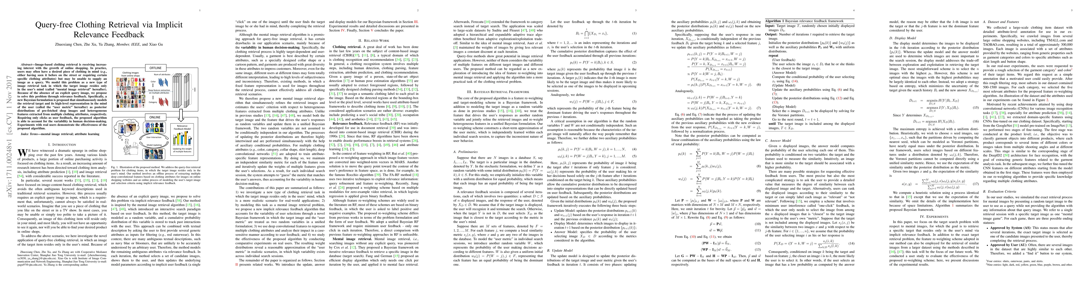 This paper proposes a Bayesian formulation for query-free clothing retrieval, addressing the challenge of users who cannot provide an image but have a mental image of desired clothing. The method leverages implicit relevance feedback through user clicks to model the user's mental representation and improve retrieval accuracy.