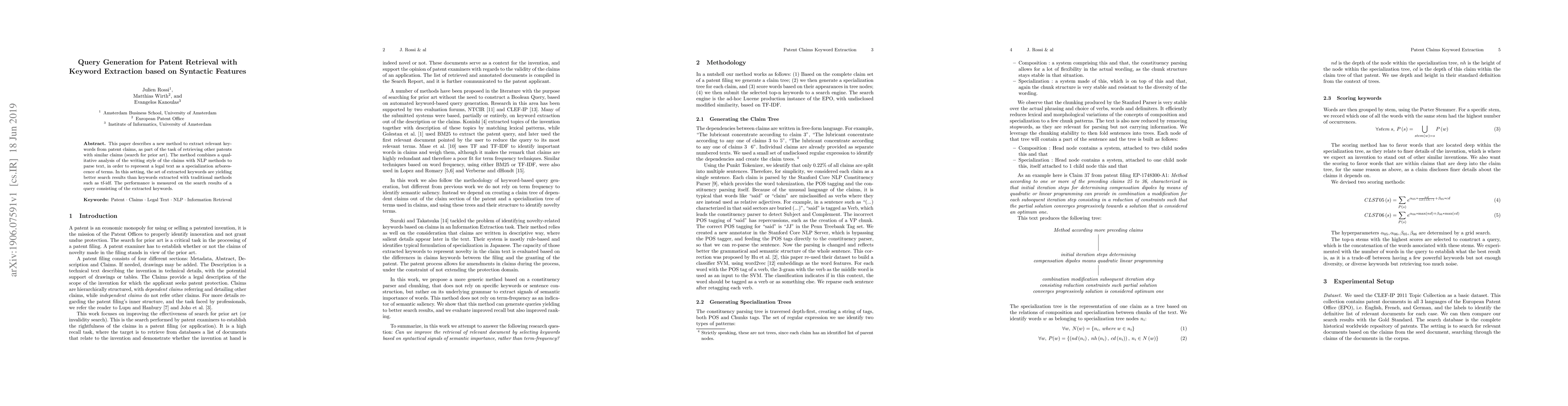 This paper proposes a novel method for extracting keywords from patent claims using syntactic features and NLP, which yields better patent retrieval results compared to traditional tf-idf methods. The effectiveness is demonstrated through improved search results for queries based on the extracted keywords.