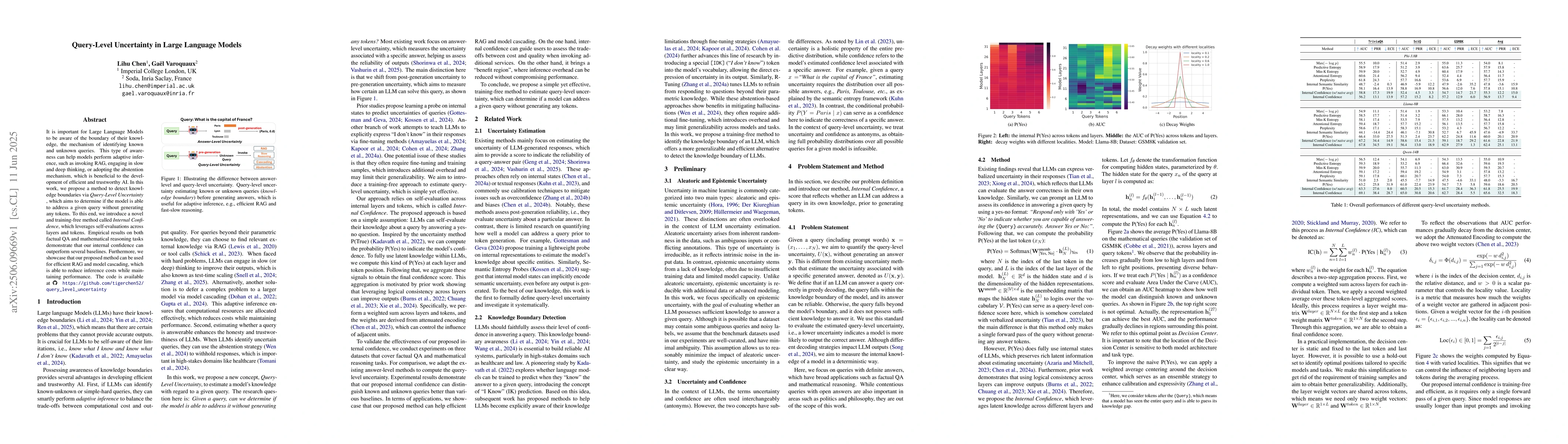 It is important for Large Language Models to be aware of the boundary of their knowledge, the mechanism of identifying known and unknown queries. This type of awareness can help models perform adaptive inference, such as invoking RAG, engaging in slow and deep thinking, or adopting the abstention mechanism, which is beneficial to the development of efficient and trustworthy AI. In this work, we propose a method to detect knowledge boundaries via Query-Level Uncertainty, which aims to determine if the model is able to address a given query without generating any tokens. To this end, we introduce a novel and training-free method called \emph{Internal Confidence}, which leverages self-evaluations across layers and tokens. Empirical results on both factual QA and mathematical reasoning tasks demonstrate that our internal confidence can outperform several baselines. Furthermore, we showcase that our proposed method can be used for efficient RAG and model cascading, which is able to reduce inference costs while maintaining performance.