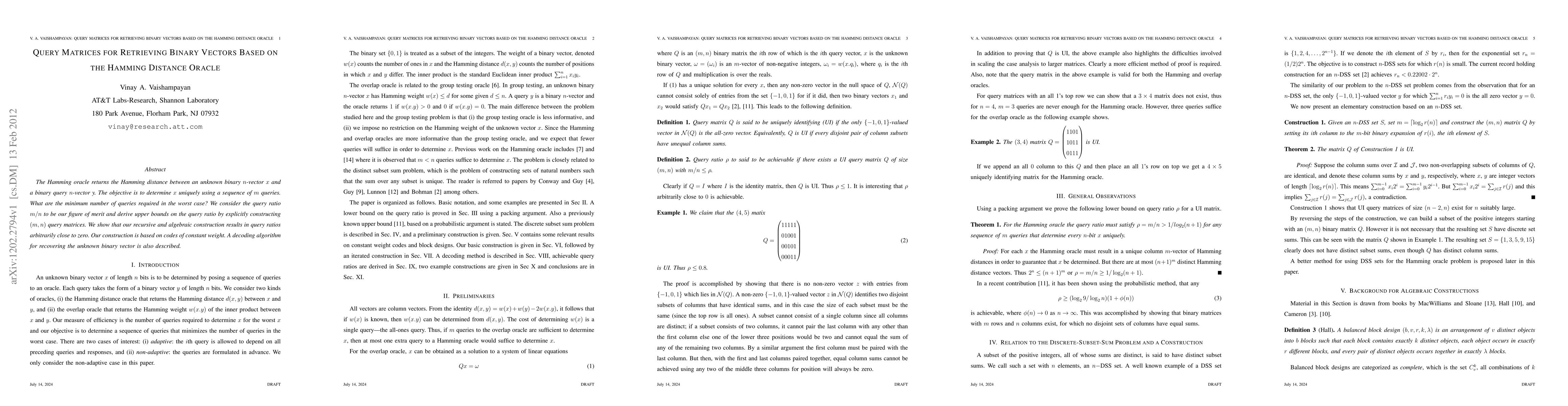 Development of a systematic approach for constructing binary query matrices for Hamming oracle using pre-existing codes.