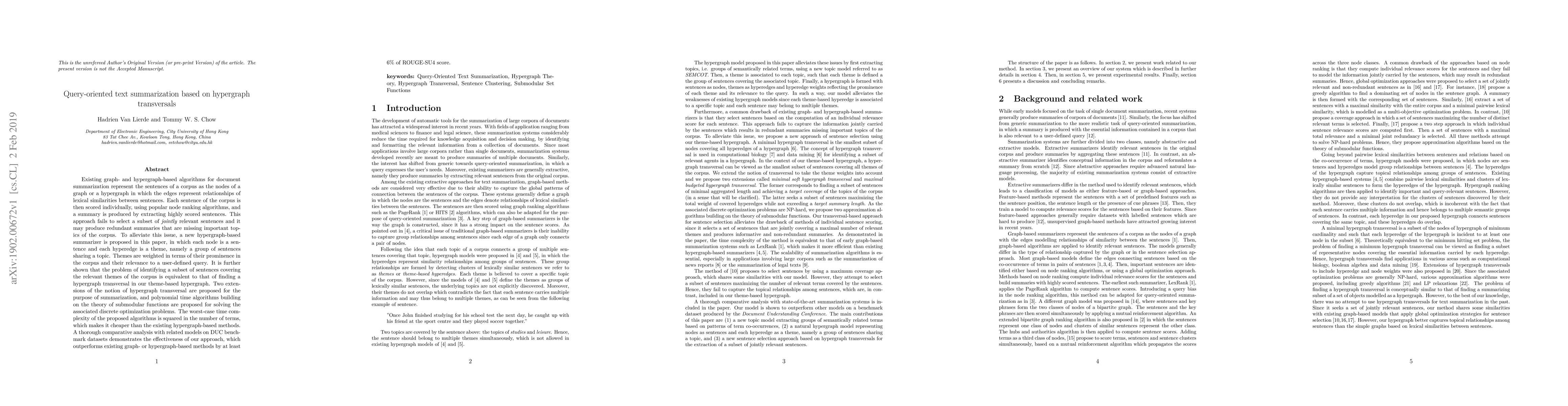 This paper proposes a new hypergraph-based summarization model where nodes are sentences and hyperedges represent themes (groups of semantically related sentences). It introduces two methods for sentence selection based on hypergraph transversals: one for minimal length summaries with target coverage, and another for maximal coverage summaries within a target length.