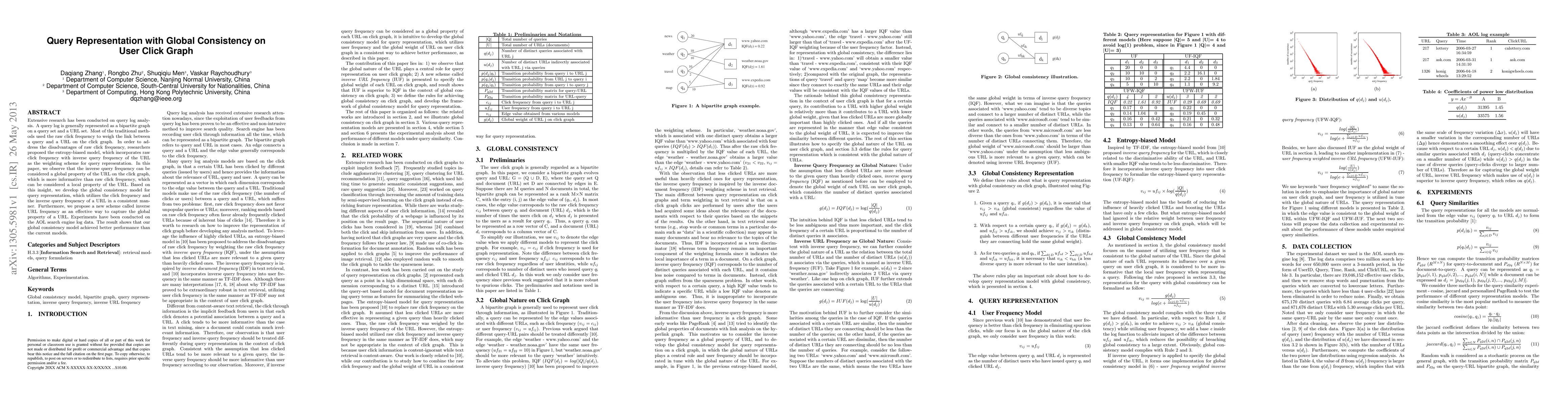 Extensive research has been conducted on query log analysis. A query log is generally represented as a bipartite graph on a query set and a URL set. Most of the traditional methods used the raw click frequency to weigh the link between a query and a URL on the click graph. In order to address the disadvantages of raw click frequency, researchers proposed the entropy-biased model, which incorporates raw click frequency with inverse query frequency of the URL as the weighting scheme for query representation. In this paper, we observe that the inverse query frequency can be considered a global property of the URL on the click graph, which is more informative than raw click frequency, which can be considered a local property of the URL. Based on this insight, we develop the global consistency model for query representation, which utilizes the click frequency and the inverse query frequency of a URL in a consistent manner. Furthermore, we propose a new scheme called inverse URL frequency as an effective way to capture the global property of a URL. Experiments have been conducted on the AOL search engine log data. The result shows that our global consistency model achieved better performance than the current models.