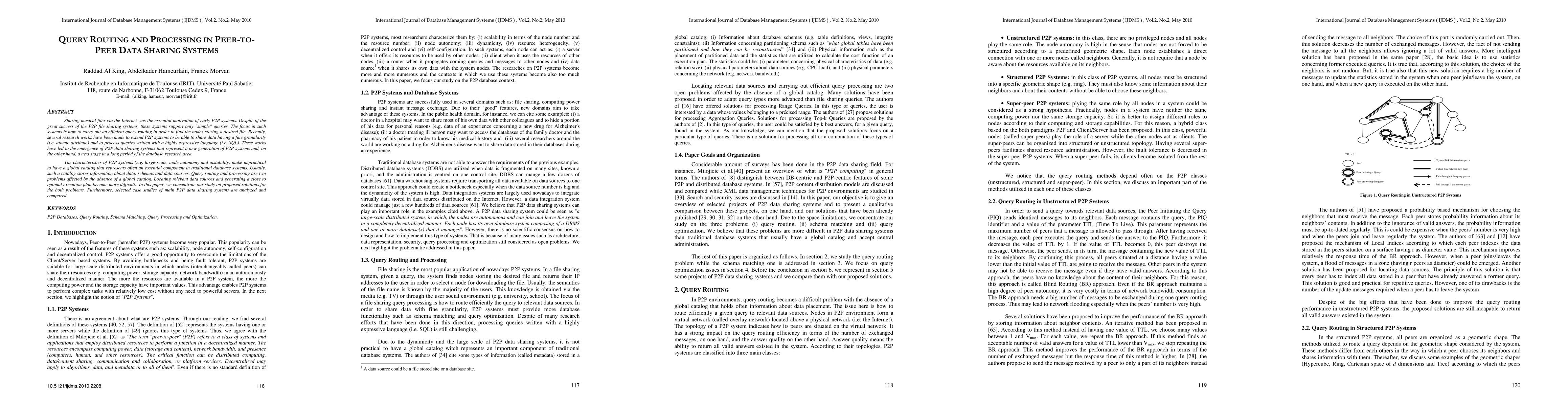 This paper explores query routing and processing in peer-to-peer data sharing systems, addressing challenges due to lack of global catalog in large-scale networks.