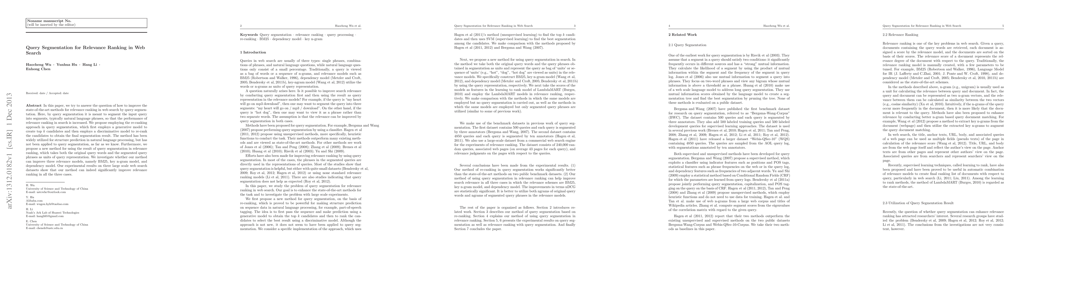 This paper proposes a query segmentation technique to enhance relevance ranking in web search by breaking queries into natural language phrases, followed by a re-ranking approach using generative and discriminative models. The method shows significant improvement over BM25, key n-gram, and dependency models in large-scale experiments.
