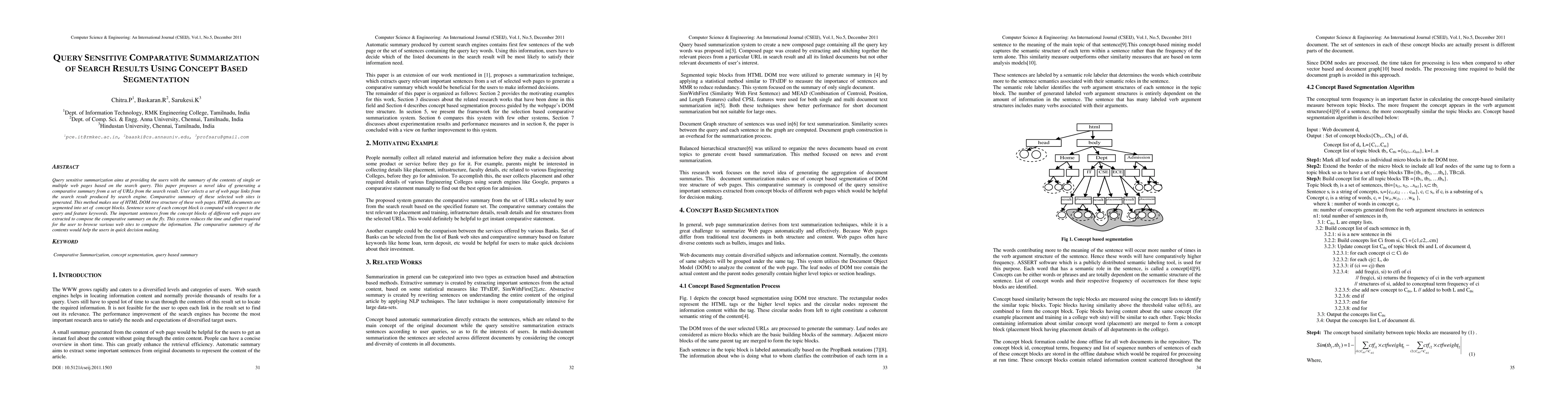 This paper proposes a method to generate comparative summaries of selected web pages from search results, using concept-based segmentation to reduce time and effort for users.