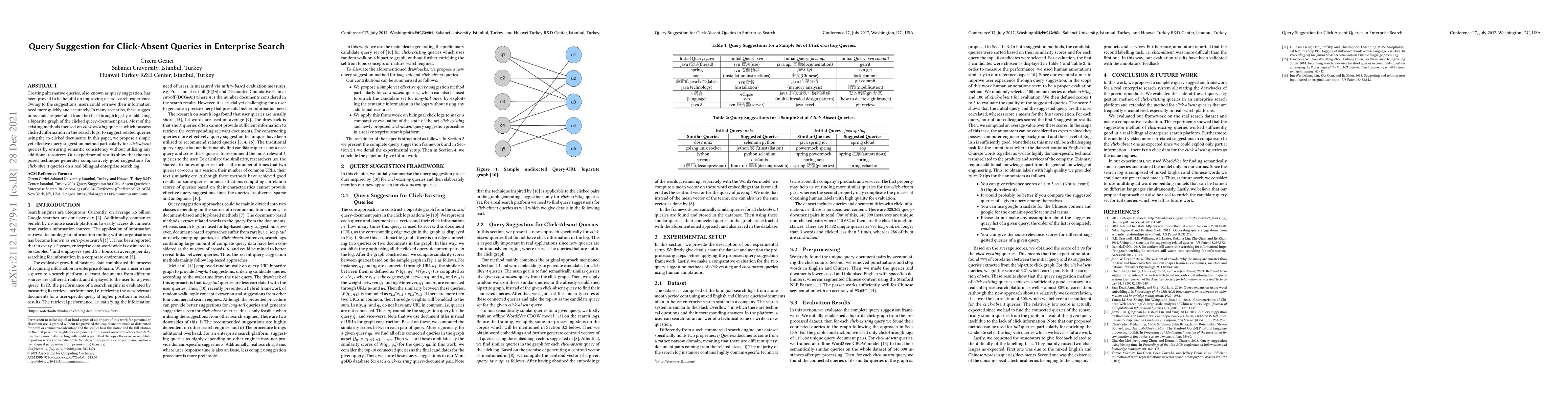 This paper introduces a novel query suggestion method for click-absent queries in enterprise search, aiming to enhance user experience by ensuring semantic consistency without extra resources. Experimental results demonstrate the effectiveness of the proposed technique on a real bilingual enterprise search log.