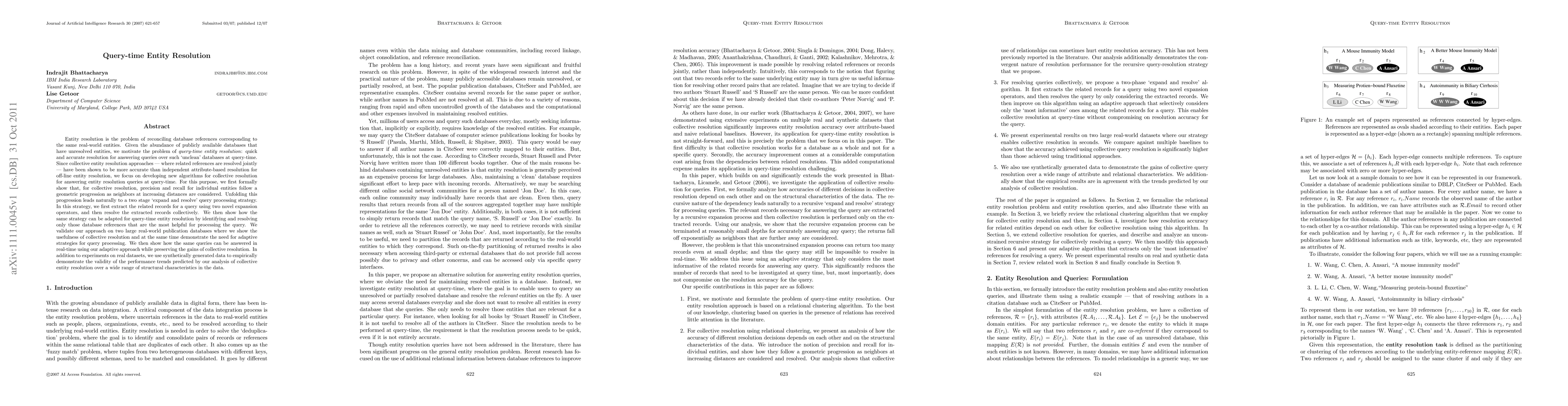 This paper develops algorithms for query-time entity resolution, focusing on collective resolution approaches that resolve related references jointly for improved accuracy. It proposes a two-stage strategy involving expansion and resolution, demonstrating the effectiveness of adaptive query processing in real-time while maintaining the benefits of collective resolution through experiments on real and synthetic datasets.