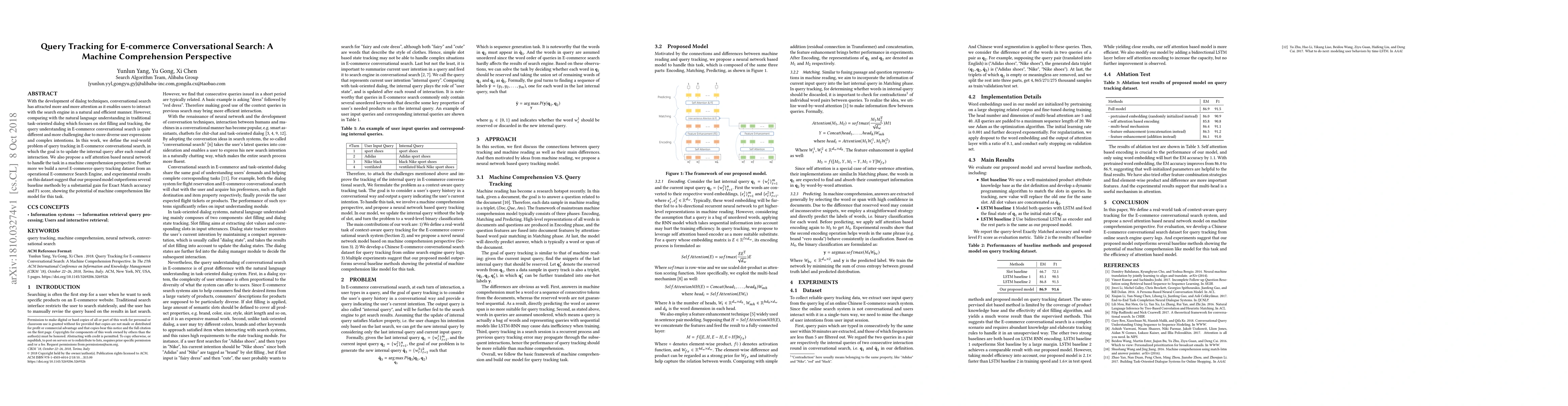 This paper tackles query tracking in E-commerce conversational search using a machine comprehension approach with a self-attention neural network. The study introduces a new dataset from an operational E-commerce search engine, demonstrating superior performance of the proposed model over baselines in Exact Match accuracy and F1 score.