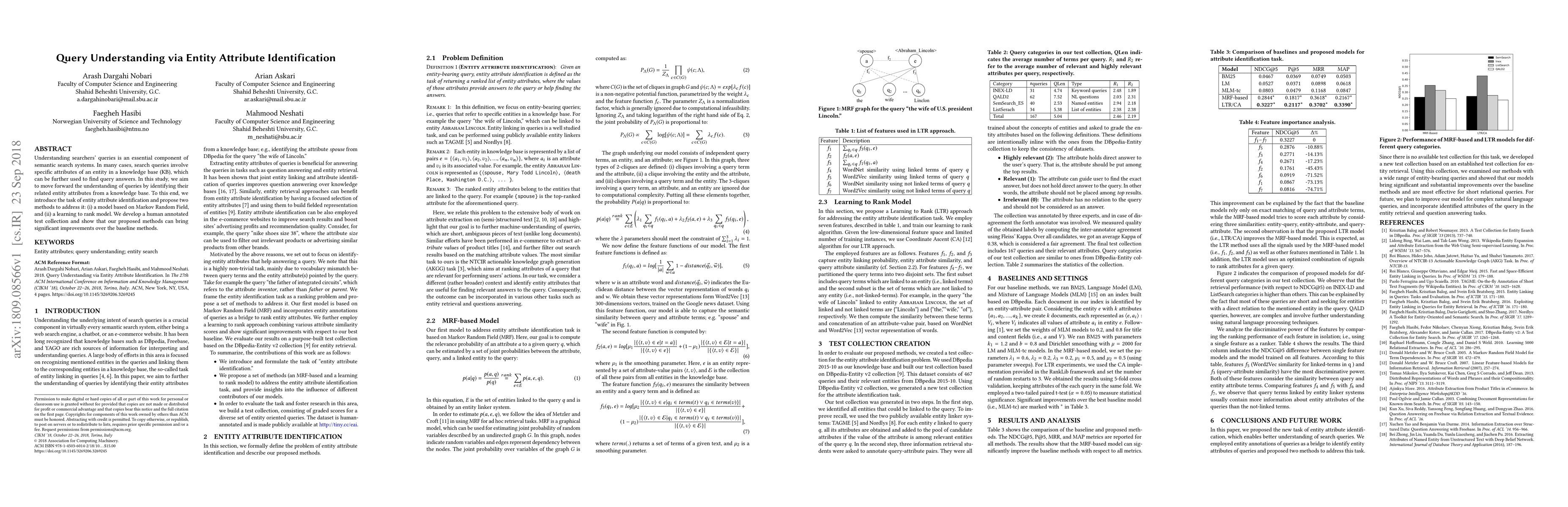 This paper introduces the task of entity attribute identification to enhance query understanding in semantic search systems. It proposes two methods—a Markov Random Field model and a learning to rank model—and demonstrates their effectiveness through a human-annotated test collection, showing significant improvements over baseline methods.