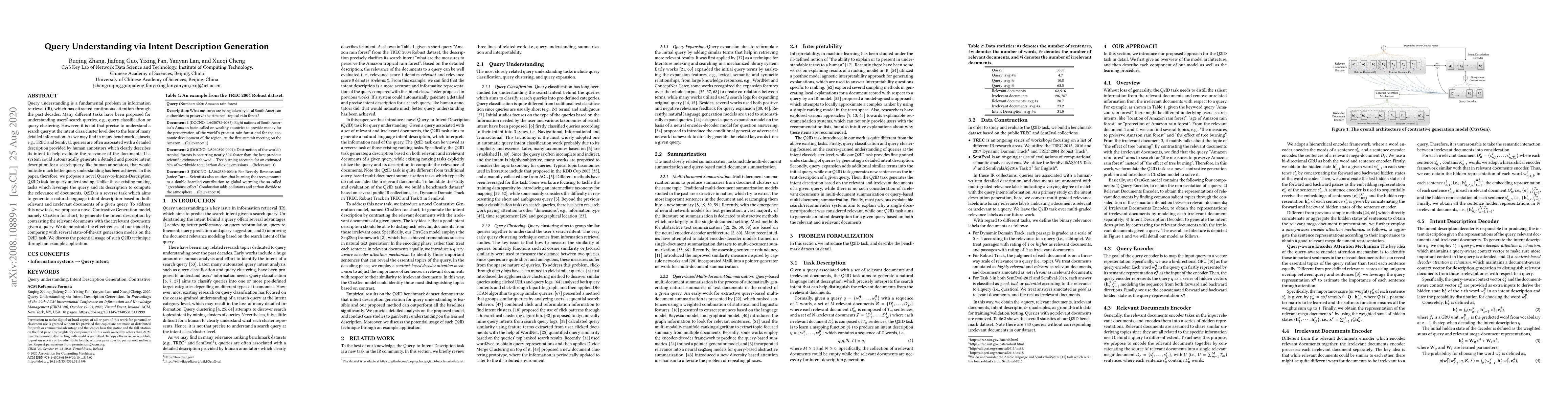 This paper introduces a novel Query-to-Intent-Description (Q2ID) task for better query understanding by generating detailed intent descriptions. It proposes a Contrastive Generation model, CtrsGen, to generate these descriptions by contrasting relevant and irrelevant documents, demonstrating its effectiveness against other state-of-the-art models.