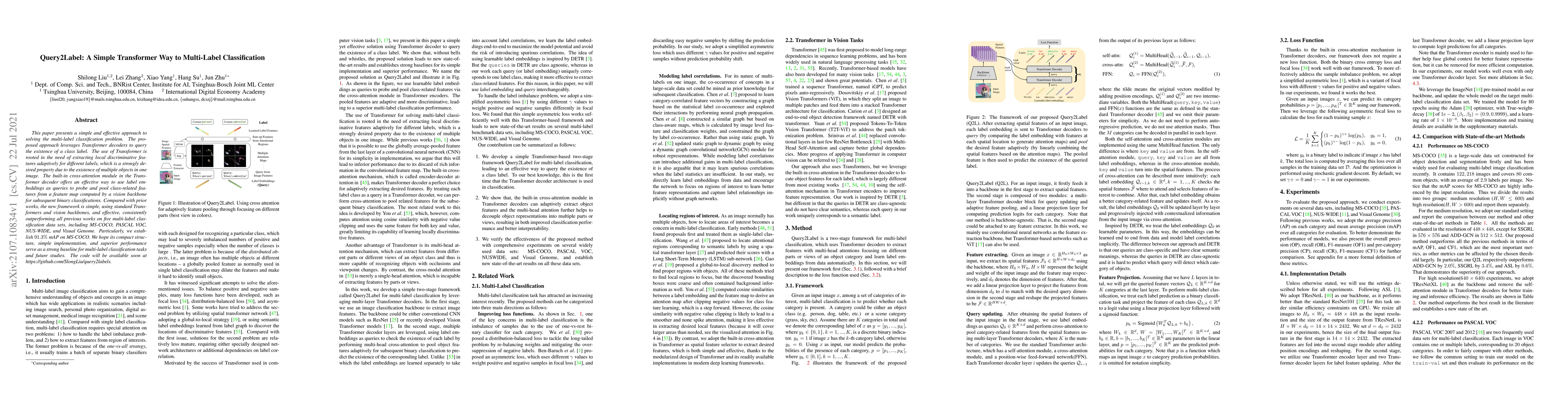 This paper proposes a simple Transformer-based approach called Query2Label for multi-label classification, leveraging Transformer decoders to adaptively extract local discriminative features. The method outperforms previous works on five datasets, establishing a new state-of-the-art with 91.3% mAP on MS-COCO.