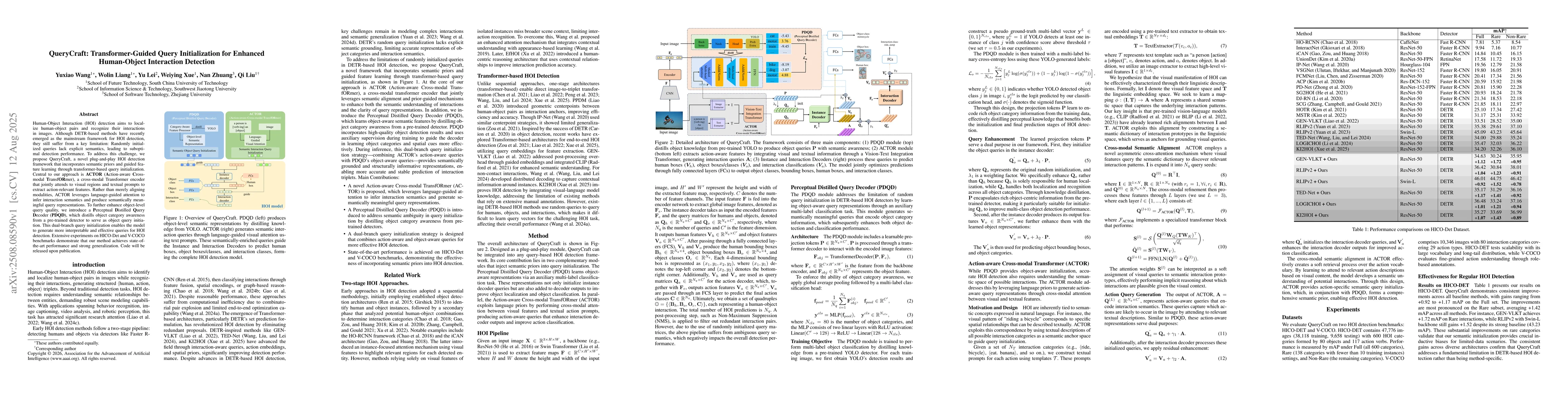 Human-Object Interaction (HOI) detection aims to localize human-object pairs and recognize their interactions in images. Although DETR-based methods have recently emerged as the mainstream framework for HOI detection, they still suffer from a key limitation: Randomly initialized queries lack explicit semantics, leading to suboptimal detection performance. To address this challenge, we propose QueryCraft, a novel plug-and-play HOI detection framework that incorporates semantic priors and guided feature learning through transformer-based query initialization. Central to our approach is \textbf{ACTOR} (\textbf{A}ction-aware \textbf{C}ross-modal \textbf{T}ransf\textbf{OR}mer), a cross-modal Transformer encoder that jointly attends to visual regions and textual prompts to extract action-relevant features. Rather than merely aligning modalities, ACTOR leverages language-guided attention to infer interaction semantics and produce semantically meaningful query representations. To further enhance object-level query quality, we introduce a \textbf{P}erceptual \textbf{D}istilled \textbf{Q}uery \textbf{D}ecoder (\textbf{PDQD}), which distills object category awareness from a pre-trained detector to serve as object query initiation. This dual-branch query initialization enables the model to generate more interpretable and effective queries for HOI detection. Extensive experiments on HICO-Det and V-COCO benchmarks demonstrate that our method achieves state-of-the-art performance and strong generalization. Code will be released upon publication.