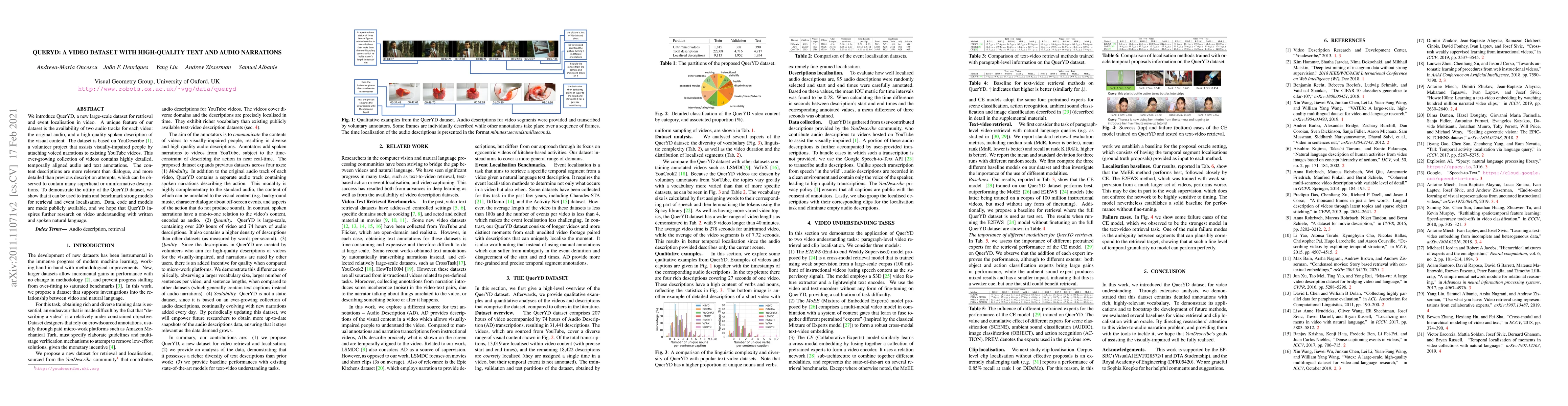 QuerYD is a large-scale video dataset featuring high-quality text and audio narrations for retrieval and event localization. It includes detailed, temporally aligned audio and text annotations, with the aim of aiding visually-impaired individuals and advancing research in video understanding.