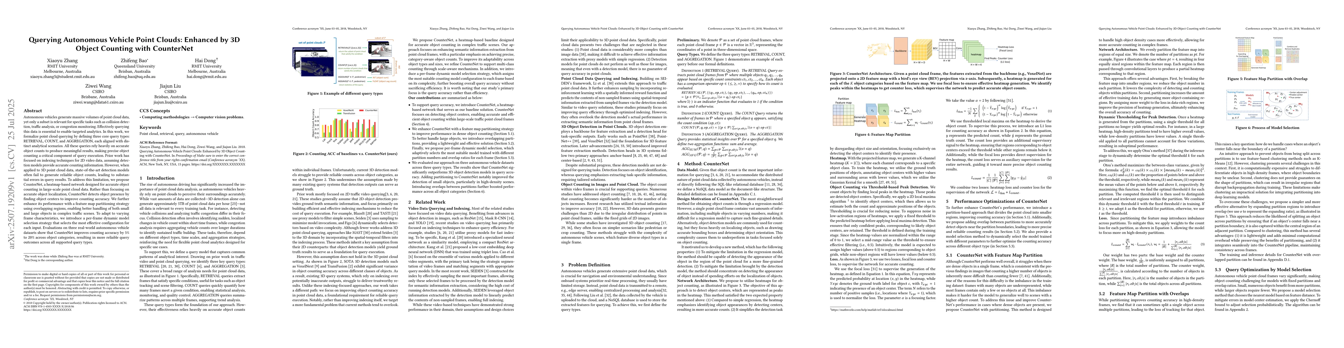 Autonomous vehicles generate massive volumes of point cloud data, yet only a subset is relevant for specific tasks such as collision detection, traffic analysis, or congestion monitoring. Effectively querying this data is essential to enable targeted analytics. In this work, we formalize point cloud querying by defining three core query types: RETRIEVAL, COUNT, and AGGREGATION, each aligned with distinct analytical scenarios. All these queries rely heavily on accurate object counts to produce meaningful results, making precise object counting a critical component of query execution. Prior work has focused on indexing techniques for 2D video data, assuming detection models provide accurate counting information. However, when applied to 3D point cloud data, state-of-the-art detection models often fail to generate reliable object counts, leading to substantial errors in query results. To address this limitation, we propose CounterNet, a heatmap-based network designed for accurate object counting in large-scale point cloud data. Rather than focusing on accurate object localization, CounterNet detects object presence by finding object centers to improve counting accuracy. We further enhance its performance with a feature map partitioning strategy using overlapping regions, enabling better handling of both small and large objects in complex traffic scenes. To adapt to varying frame characteristics, we introduce a per-frame dynamic model selection strategy that selects the most effective configuration for each input. Evaluations on three real-world autonomous vehicle datasets show that CounterNet improves counting accuracy by 5% to 20% across object categories, resulting in more reliable query outcomes across all supported query types.